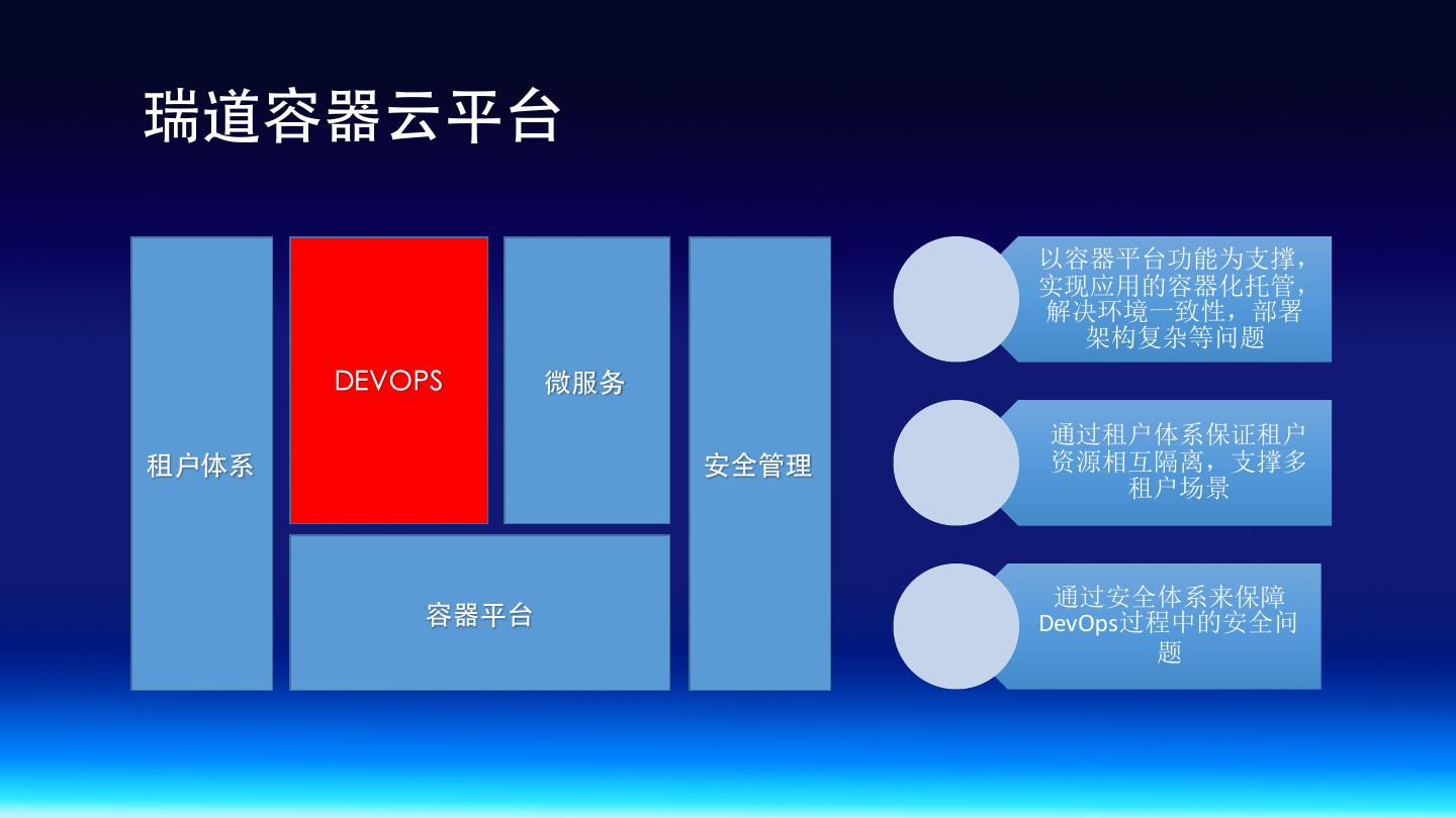 6 .瑞道容器云平台 以容器平台功能为支撑, 实现应用的容器化托管, 解决环境一致性,部署 架构复杂等问题 DEVOPS 微服务 通过租户体系保证租户 租户体系 安全管理 资源相互隔离,支撑多 租户场景 通过安全体系来保障 容器平台 DevOps过程中的安全问 题