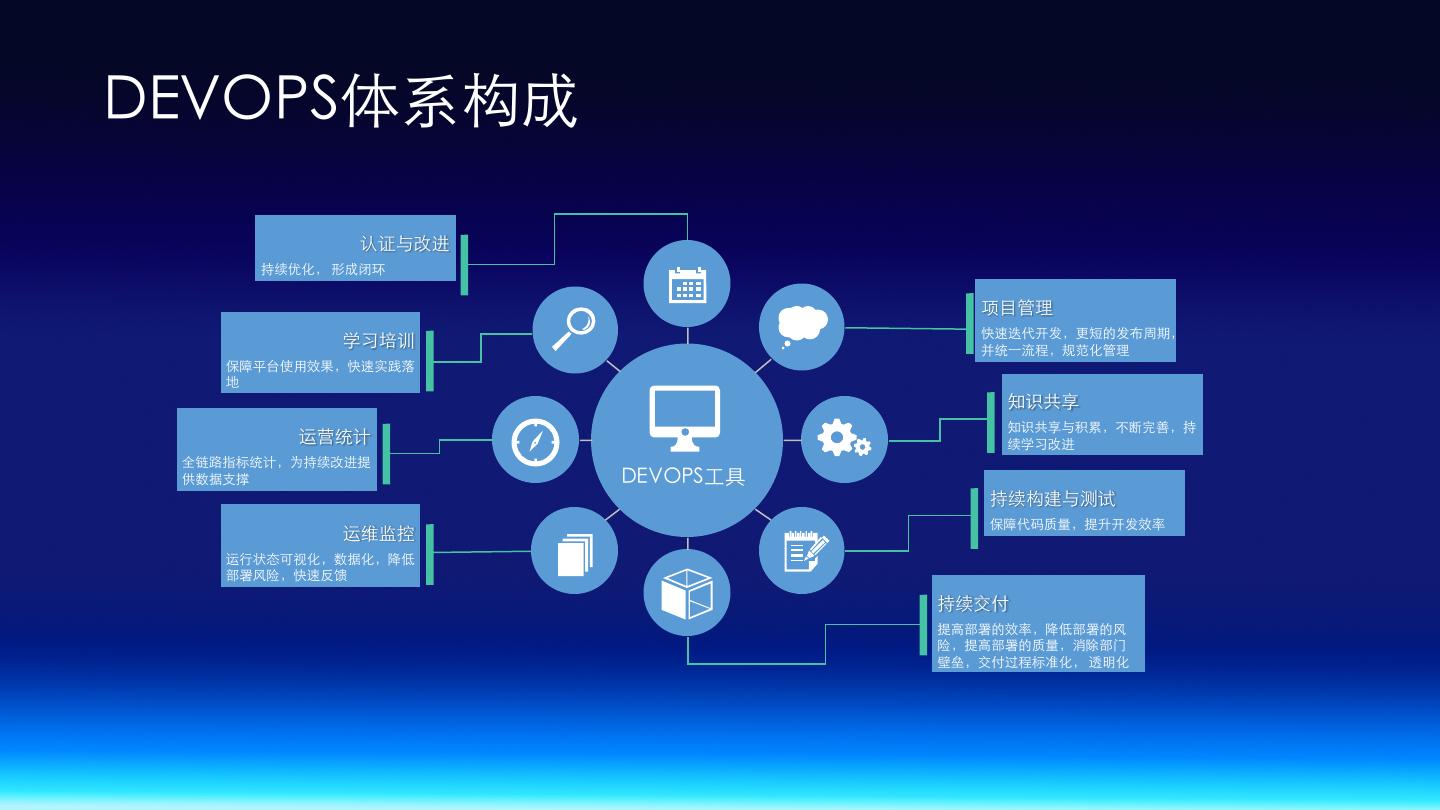 7 .DEVOPS体系构成 认证与改进 持续优化, 形成闭环 项⺫管理 快速迭代开发,更短的发布周期, 学习培训 并统⼀流程,规范化管理 保障平台使⽤效果,快速实践落 地 知识共享 知识共享与积累,不断完善,持 运营统计 续学习改进 全链路指标统计,为持续改进提 供数据⽀撑 DEVOPS⼯具 持续构建与测试 保障代码质量,提升开发效率 运维监控 运⾏状态可视化,数据化,降低 部署⻛险,快速反馈 持续交付 提⾼部署的效率,降低部署的⻛ 险,提⾼部署的质量,消除部⻔ 壁垒,交付过程标准化, 透明化