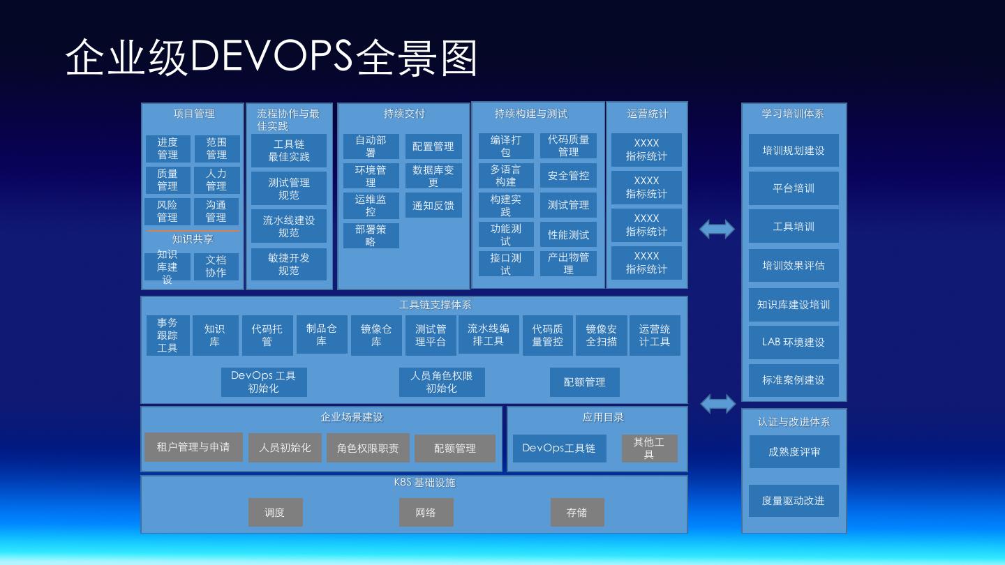 8 .企业级DEVOPS全景图 项⺫管理 流程协作与最 持续交付 持续构建与测试 运营统计 学习培训体系 佳实践 进度 范围 ⼯具链 ⾃动部 编译打 代码质量 XXXX 配置管理 培训规划建设 管理 管理 最佳实践 署 包 管理 指标统计 质量 ⼈⼒ 环境管 数据库变 多语⾔ 安全管控 管理 管理 测试管理 理 更 构建 XXXX 指标统计 平台培训 规范 运维监 构建实 ⻛险 沟通 通知反馈 测试管理 控 践 管理 管理 流⽔线建设 XXXX 部署策 功能测 指标统计 ⼯具培训 规范 性能测试 知识共享 略 试 知识 敏捷开发 接⼝测 产出物管 XXXX ⽂档 库建 规范 试 理 指标统计 培训效果评估 协作 设 ⼯具链⽀撑体系 知识库建设培训 事务 知识 代码托 制品仓 镜像仓 测试管 流⽔线编 代码质 镜像安 运营统 跟踪 库 管 库 库 理平台 排⼯具 量管控 全扫描 计⼯具 LAB 环境建设 ⼯具 DevOps ⼯具 ⼈员⾓⾊权限 标准案例建设 配额管理 初始化 初始化 企业场景建设 应⽤⺫录 认证与改进体系 租户管理与申请 其他⼯ ⼈员初始化 ⾓⾊权限职责 配额管理 DevOps⼯具链 成熟度评审 具 K8S 基础设施 度量驱动改进 调度 ⺴络 存储