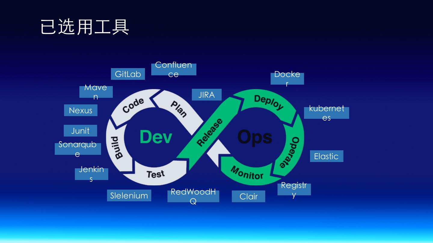 9 .已选⽤⼯具 Confluen GitLab ce Docke Mave r n JIRA Nexus kubernet es Junit Sonarqub e Elastic Jenkin s Registr Slelenium RedWoodH y Clair Q