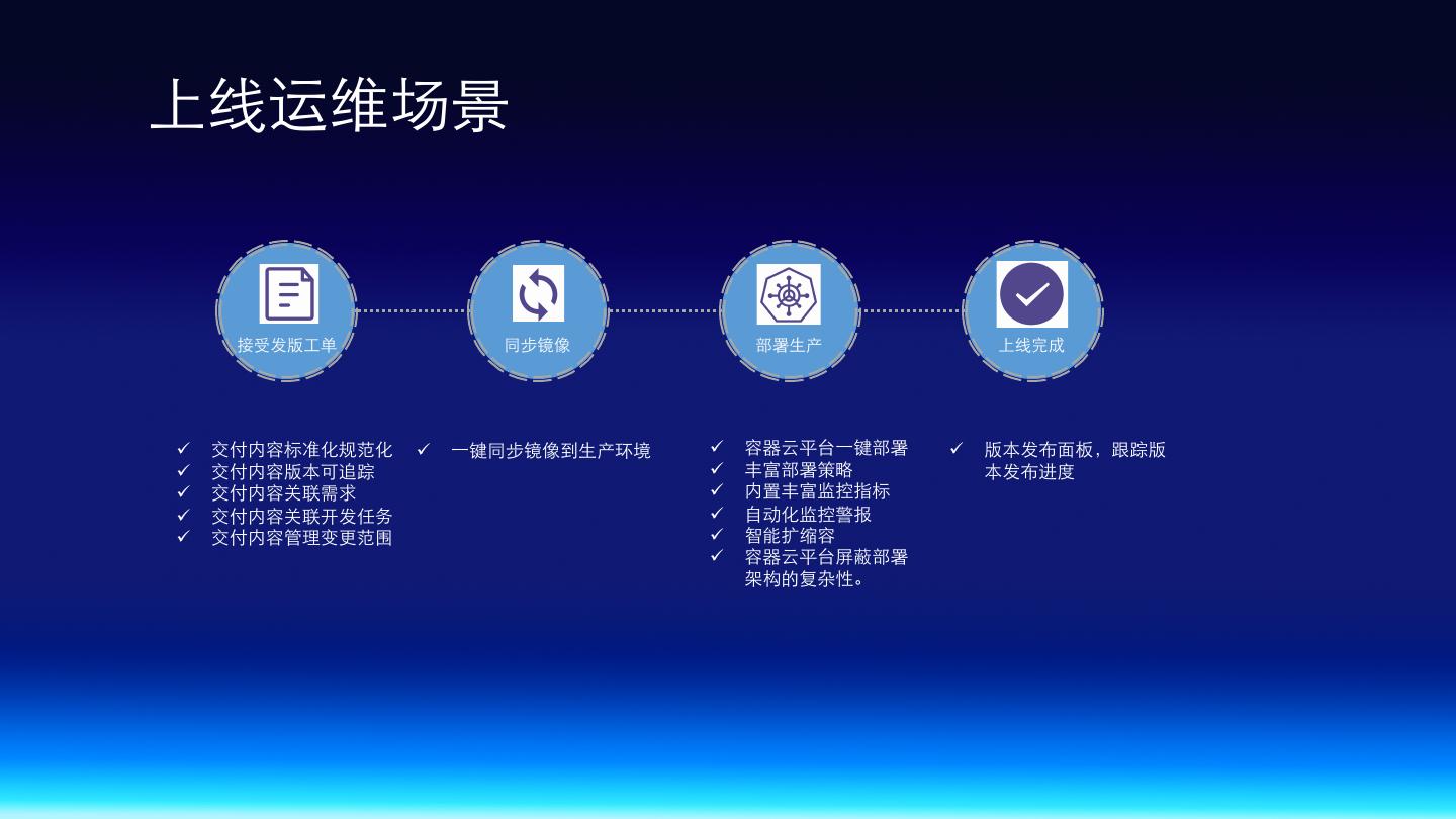 17 .上线运维场景 接受发版⼯单 同步镜像 部署⽣产 上线完成 ü 交付内容标准化规范化 ü ⼀键同步镜像到⽣产环境 ü 容器云平台⼀键部署 ü 版本发布⾯板,跟踪版 ü 交付内容版本可追踪 ü 丰富部署策略 本发布进度 ü 交付内容关联需求 ü 内置丰富监控指标 ü 交付内容关联开发任务 ü ⾃动化监控警报 ü 交付内容管理变更范围 ü 智能扩缩容 ü 容器云平台屏蔽部署 架构的复杂性。