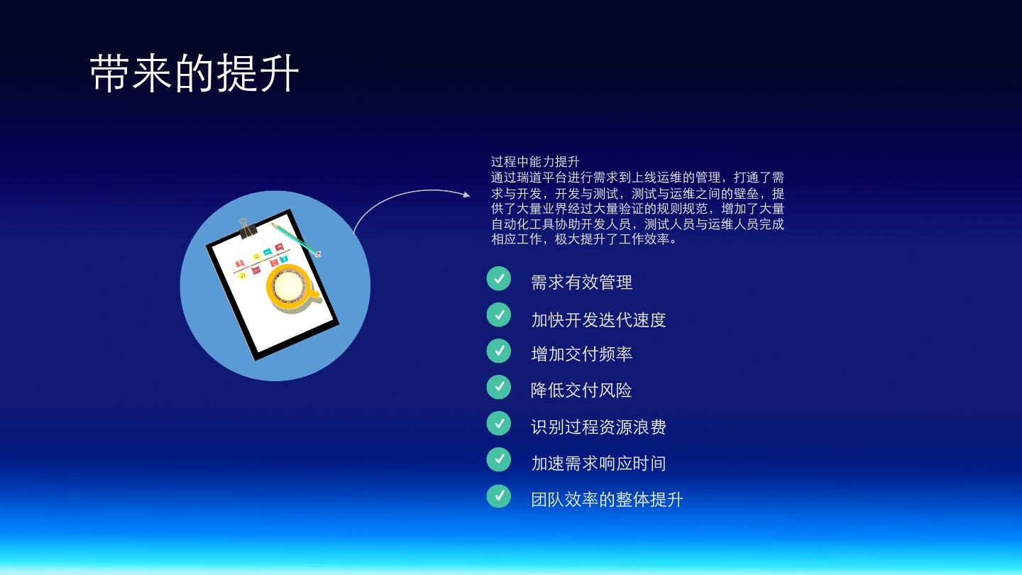 18 .带来的提升 过程中能⼒提升 通过瑞道平台进⾏需求到上线运维的管理,打通了需 求与开发,开发与测试,测试与运维之间的壁垒,提 供了⼤量业界经过⼤量验证的规则规范,增加了⼤量 ⾃动化⼯具协助开发⼈员,测试⼈员与运维⼈员完成 相应⼯作,极⼤提升了⼯作效率。 需求有效管理 加快开发迭代速度 增加交付频率 降低交付⻛险 识别过程资源浪费 加速需求响应时间 团队效率的整体提升