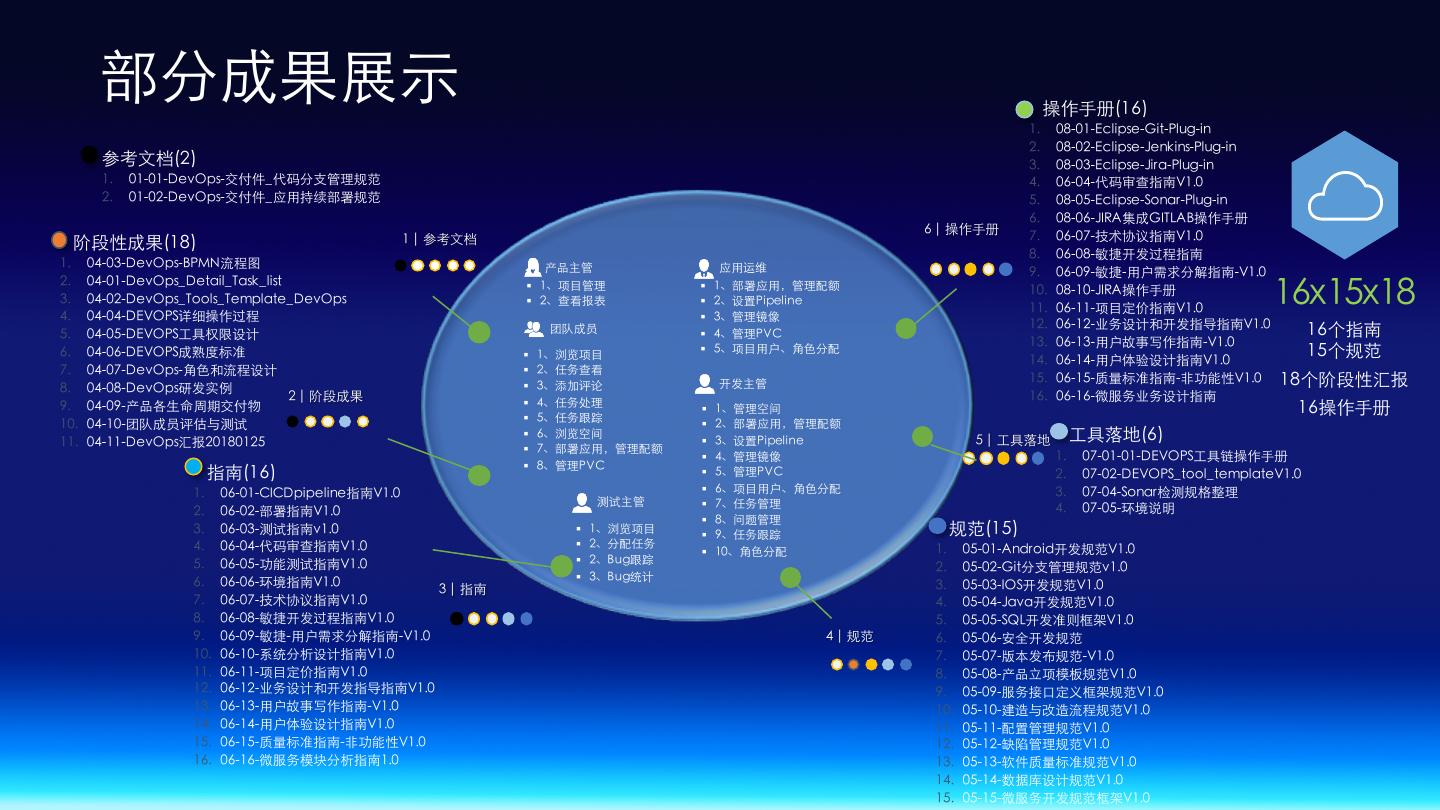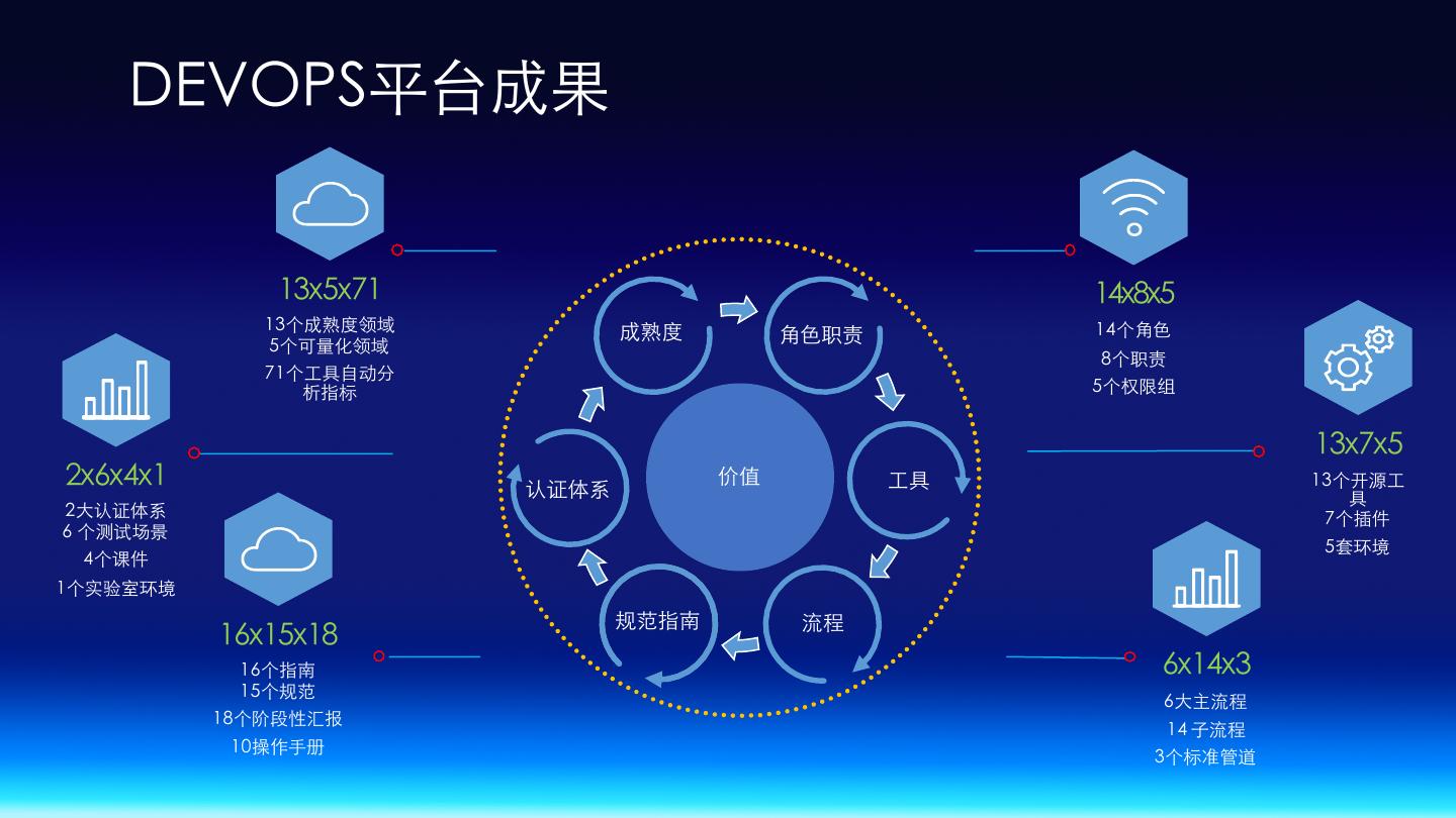 19 . DEVOPS平台成果 13x5x71 14x8x5 13个成熟度领域 成熟度 14个⾓⾊ 5个可量化领域 ⾓⾊职责 8个职责 71个⼯具⾃动分 析指标 5个权限组 13x7x5 2x6x4x1 认证体系 价值 ⼯具 13个开源⼯ 具 2⼤认证体系 7个插件 6 个测试场景 5套环境 4个课件 1个实验室环境 规范指南 流程 16x15x18 16个指南 6x14x3 15个规范 6⼤主流程 18个阶段性汇报 14 ⼦流程 10操作⼿册 3个标准管道