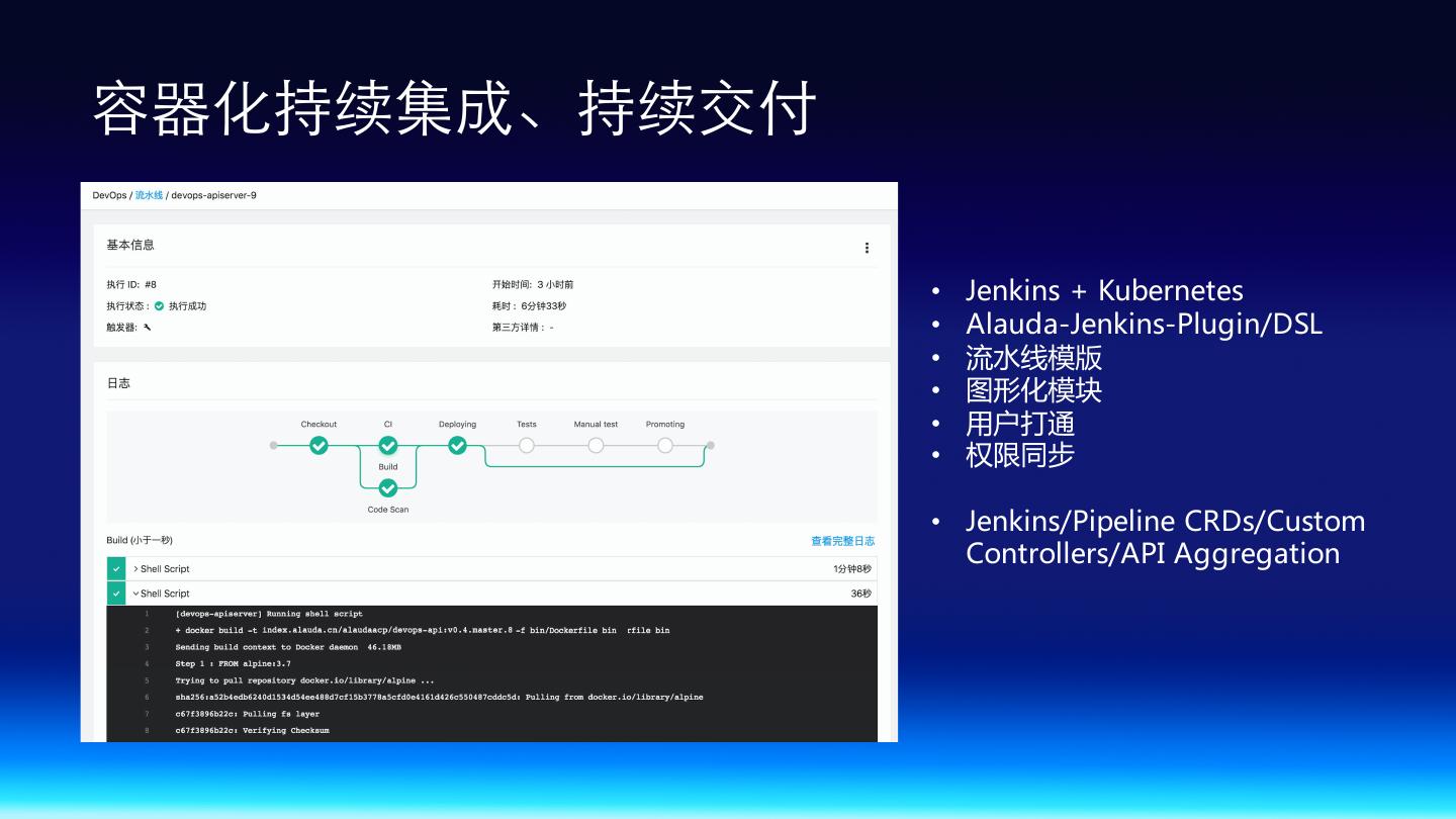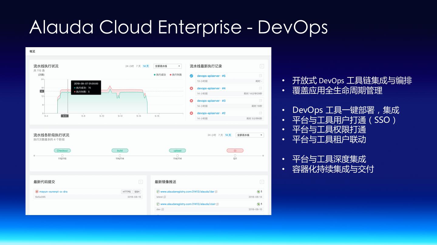 23 .Alauda Cloud Enterprise - DevOps • 开放式 DevOps 工具链集成与编排 • 覆盖应用全生命周期管理 • DevOps 工具一键部署,集成 • 平台与工具用户打通(SSO) • 平台与工具权限打通 • 平台与工具租户联动 • 平台与工具深度集成 • 容器化持续集成与交付