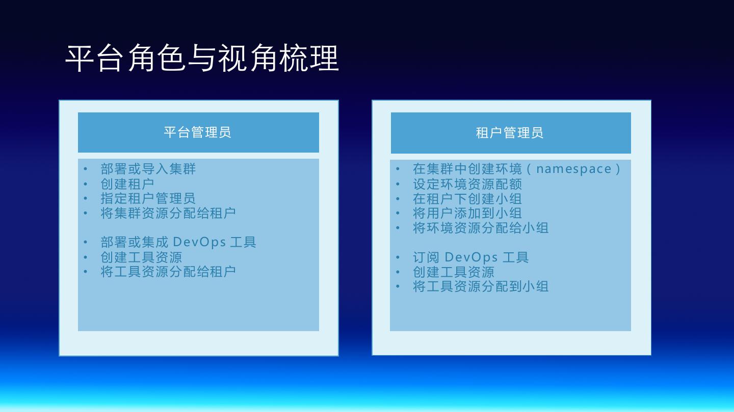24 .平台⾓⾊与视⾓梳理 平台管理员 租户管理员 • 部署或导入集群 • 在 集 群 中 创 建 环 境( nam esp ac e) • 创建租户 • 设定环境资源配额 • 指定租户管理员 • 在租户下创建小组 • 将 集 群 资 源 分 配 给租 户 • 将用户添加到小组 • 将 环 境 资 源 分 配 给小 组 • 部署或集成 DevOps 工具 • 创建工具资源 • 订阅 DevOps 工具 • 将 工 具 资 源 分 配 给租 户 • 创建工具资源 • 将 工 具 资 源 分 配 到小 组