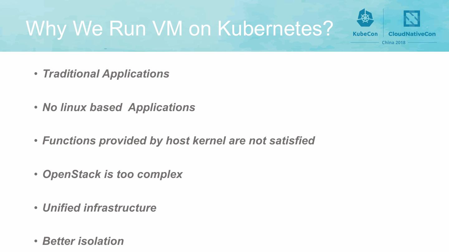 3 .Why We Run VM on Kubernetes? • Traditional Applications • No linux based Applications • Functions provided by host kernel are not satisfied • OpenStack is too complex • Unified infrastructure • Better isolation
