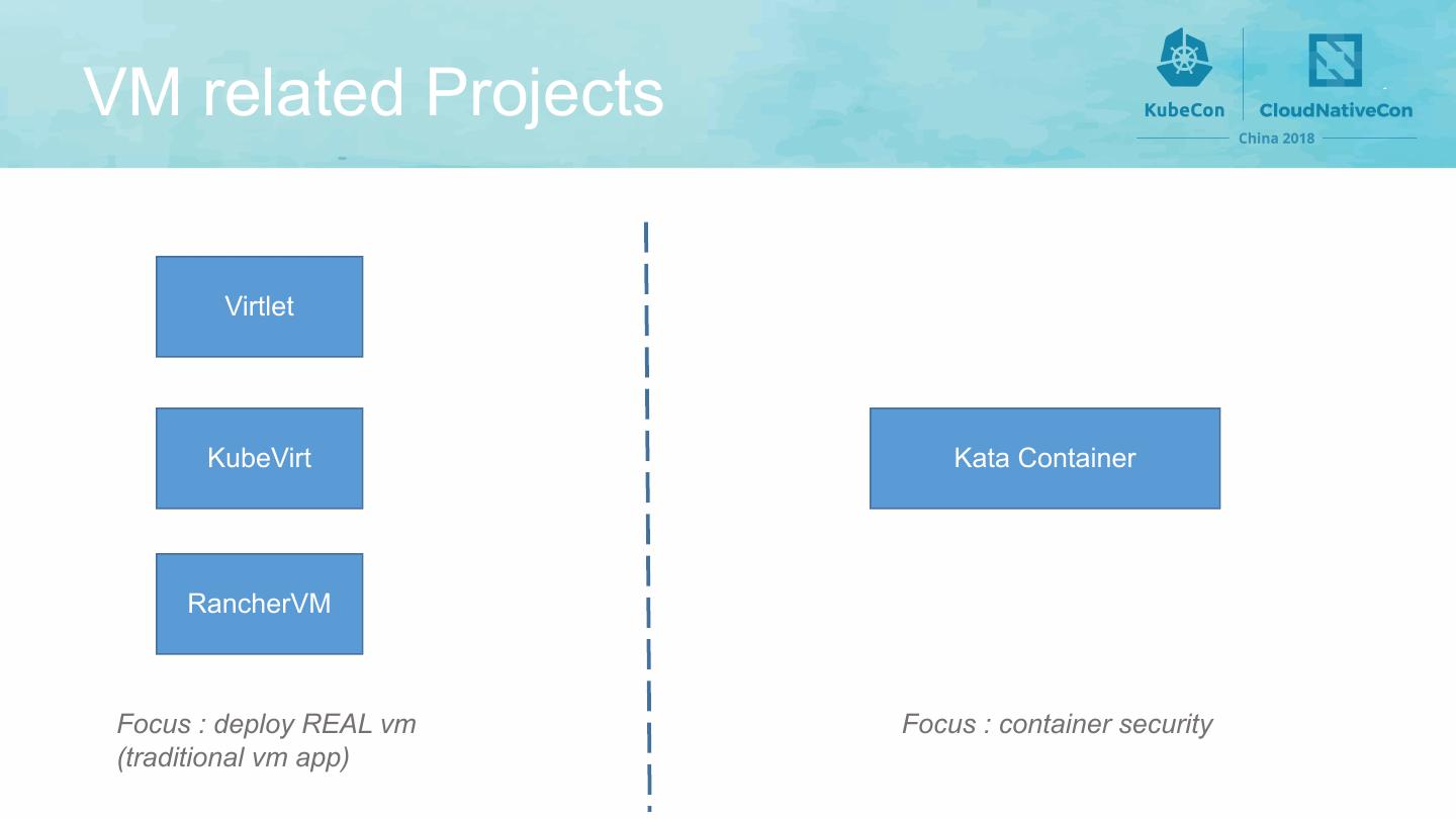 4 .VM related Projects Virtlet KubeVirt Kata Container RancherVM Focus : deploy REAL vm Focus : container security (traditional vm app)