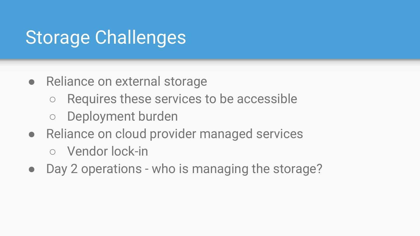 4 .Storage Challenges ● Reliance on external storage ○ Requires these services to be accessible ○ Deployment burden ● Reliance on cloud provider managed services ○ Vendor lock-in ● Day 2 operations - who is managing the storage?