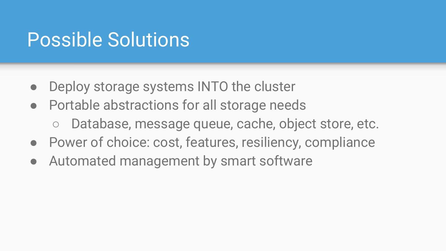 5 .Possible Solutions ● Deploy storage systems INTO the cluster ● Portable abstractions for all storage needs ○ Database, message queue, cache, object store, etc. ● Power of choice: cost, features, resiliency, compliance ● Automated management by smart software