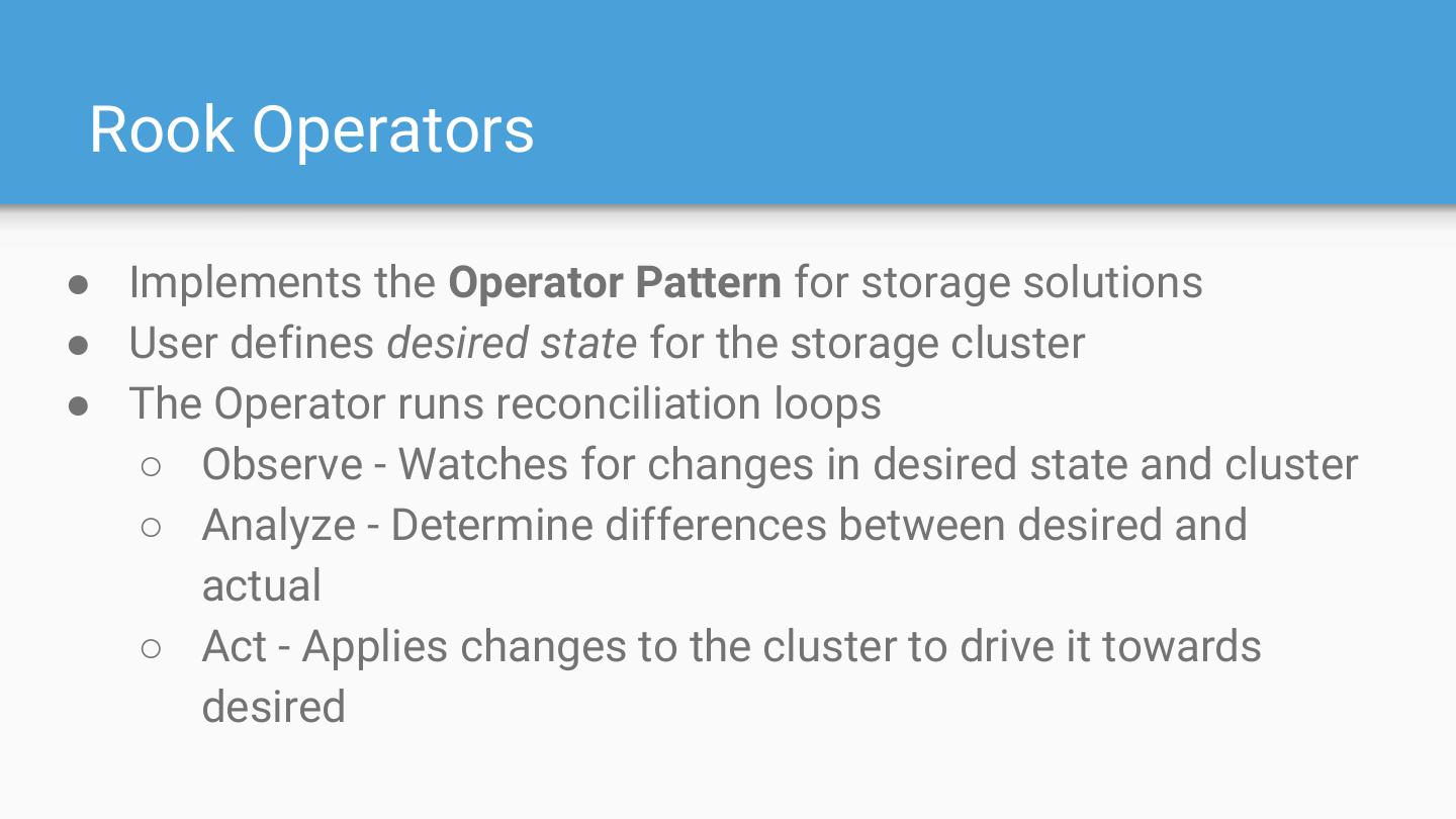 7 . Rook Operators ● Implements the Operator Pattern for storage solutions ● User defines desired state for the storage cluster ● The Operator runs reconciliation loops ○ Observe - Watches for changes in desired state and cluster ○ Analyze - Determine differences between desired and actual ○ Act - Applies changes to the cluster to drive it towards desired