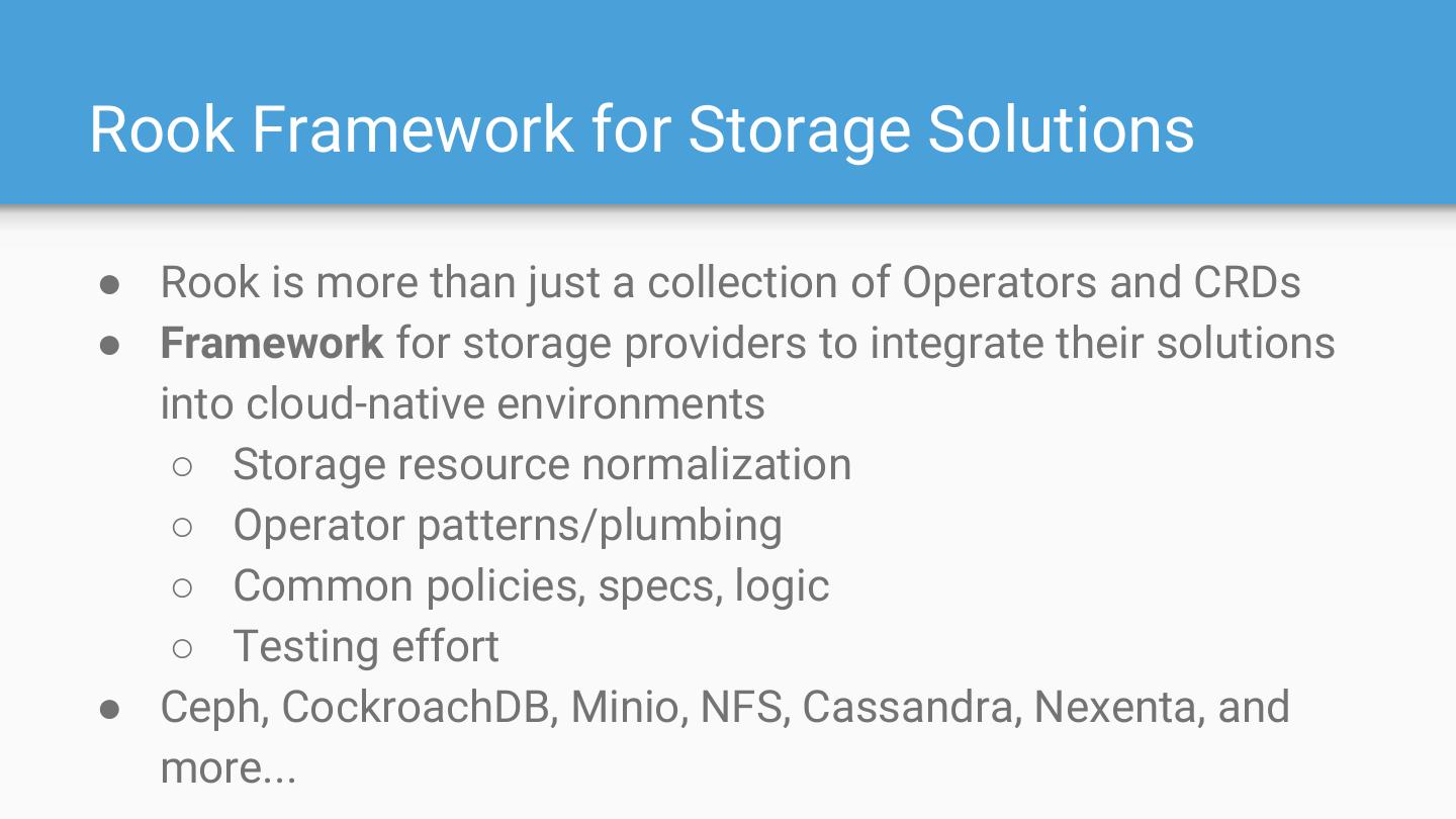 8 .Rook Framework for Storage Solutions ● Rook is more than just a collection of Operators and CRDs ● Framework for storage providers to integrate their solutions into cloud-native environments ○ Storage resource normalization ○ Operator patterns/plumbing ○ Common policies, specs, logic ○ Testing effort ● Ceph, CockroachDB, Minio, NFS, Cassandra, Nexenta, and more...