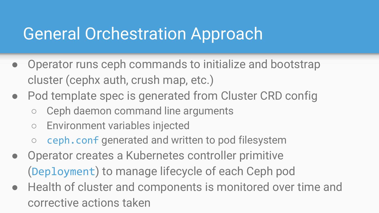 10 . General Orchestration Approach ● Operator runs ceph commands to initialize and bootstrap cluster (cephx auth, crush map, etc.) ● Pod template spec is generated from Cluster CRD config ○ Ceph daemon command line arguments ○ Environment variables injected ○ ceph.conf generated and written to pod filesystem ● Operator creates a Kubernetes controller primitive (Deployment) to manage lifecycle of each Ceph pod ● Health of cluster and components is monitored over time and corrective actions taken