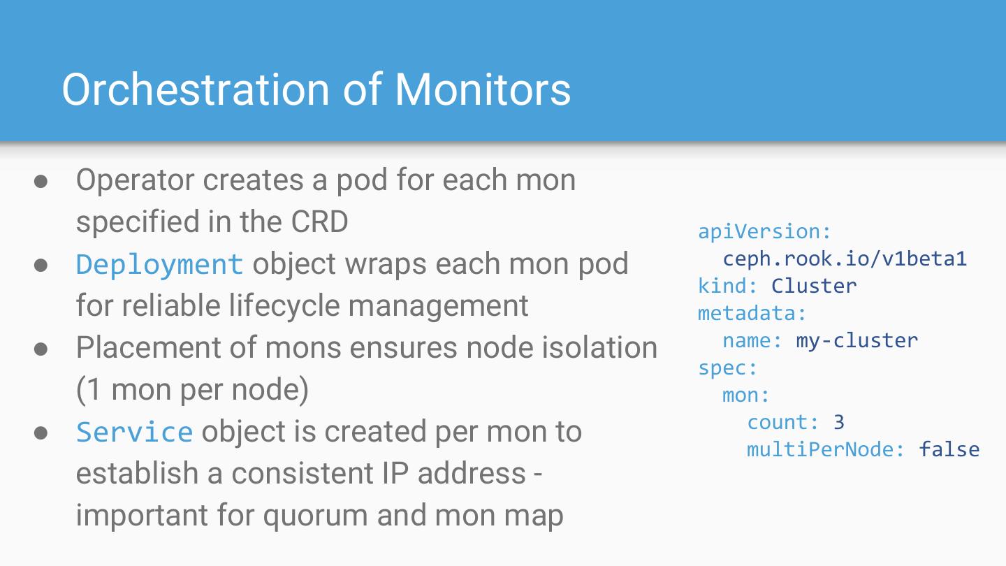 11 . Orchestration of Monitors ● Operator creates a pod for each mon specified in the CRD apiVersion: ● Deployment object wraps each mon pod ceph.rook.io/v1beta1 kind: Cluster for reliable lifecycle management metadata: ● Placement of mons ensures node isolation name: my-cluster spec: (1 mon per node) mon: count: 3 ● Service object is created per mon to multiPerNode: false establish a consistent IP address - important for quorum and mon map