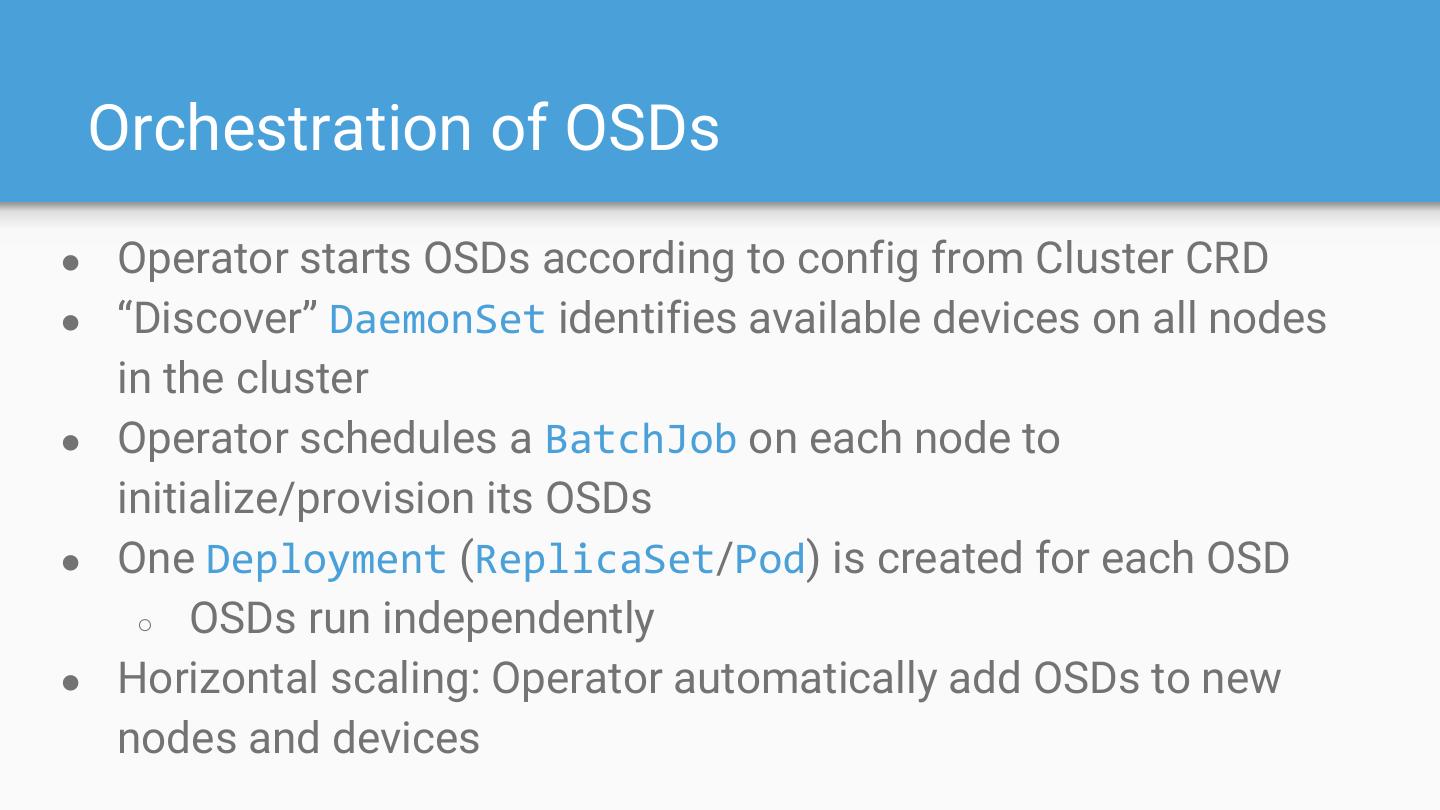 14 . Orchestration of OSDs ● Operator starts OSDs according to config from Cluster CRD ● “Discover” DaemonSet identifies available devices on all nodes in the cluster ● Operator schedules a BatchJob on each node to initialize/provision its OSDs ● One Deployment (ReplicaSet/Pod) is created for each OSD ○ OSDs run independently ● Horizontal scaling: Operator automatically add OSDs to new nodes and devices