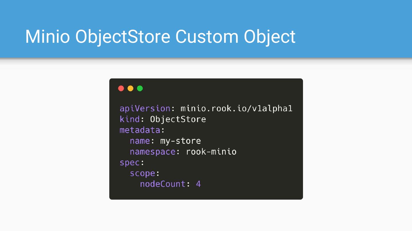 25 .Revisiting the ObjectStore ● Rook knows how to work with common information in storage object specs (networking, node counts, etc.) ● Only the credentials are Minio-specific ● We can use this information to deploy a Minio cluster