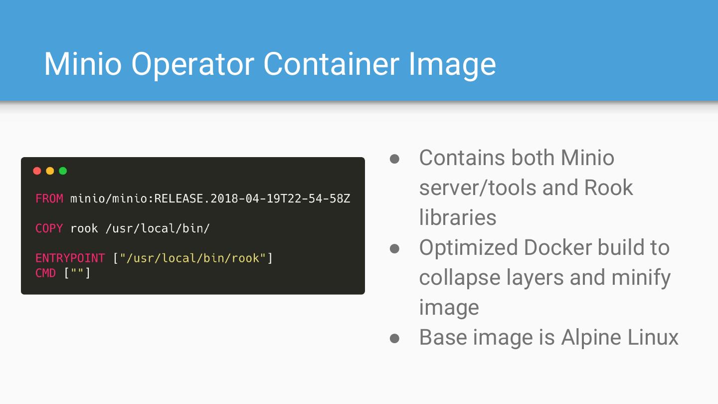 27 .Minio Operator Container Image ● Contains both Minio server/tools and Rook libraries ● Optimized Docker build to collapse layers and minify image ● Base image is Alpine Linux