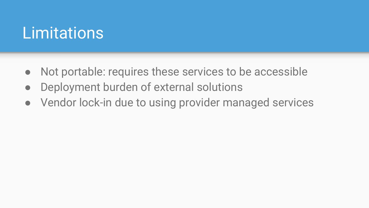 4 .Limitations ● Not portable: requires these services to be accessible ● Deployment burden of external solutions ● Vendor lock-in due to using provider managed services