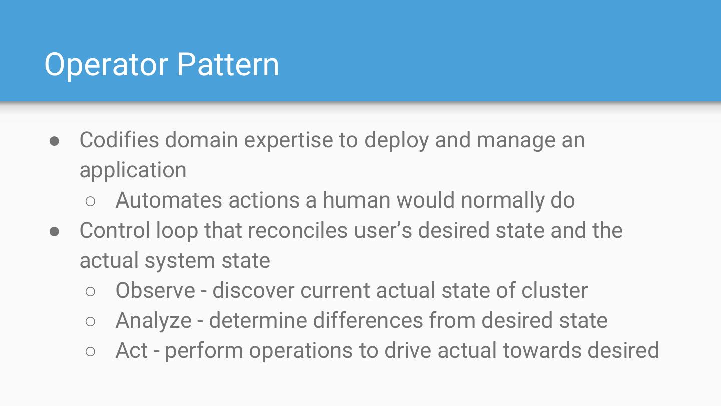 6 .Operator Pattern ● Codifies domain expertise to deploy and manage an application ○ Automates actions a human would normally do ● Control loop that reconciles user’s desired state and the actual system state ○ Observe - discover current actual state of cluster ○ Analyze - determine differences from desired state ○ Act - perform operations to drive actual towards desired