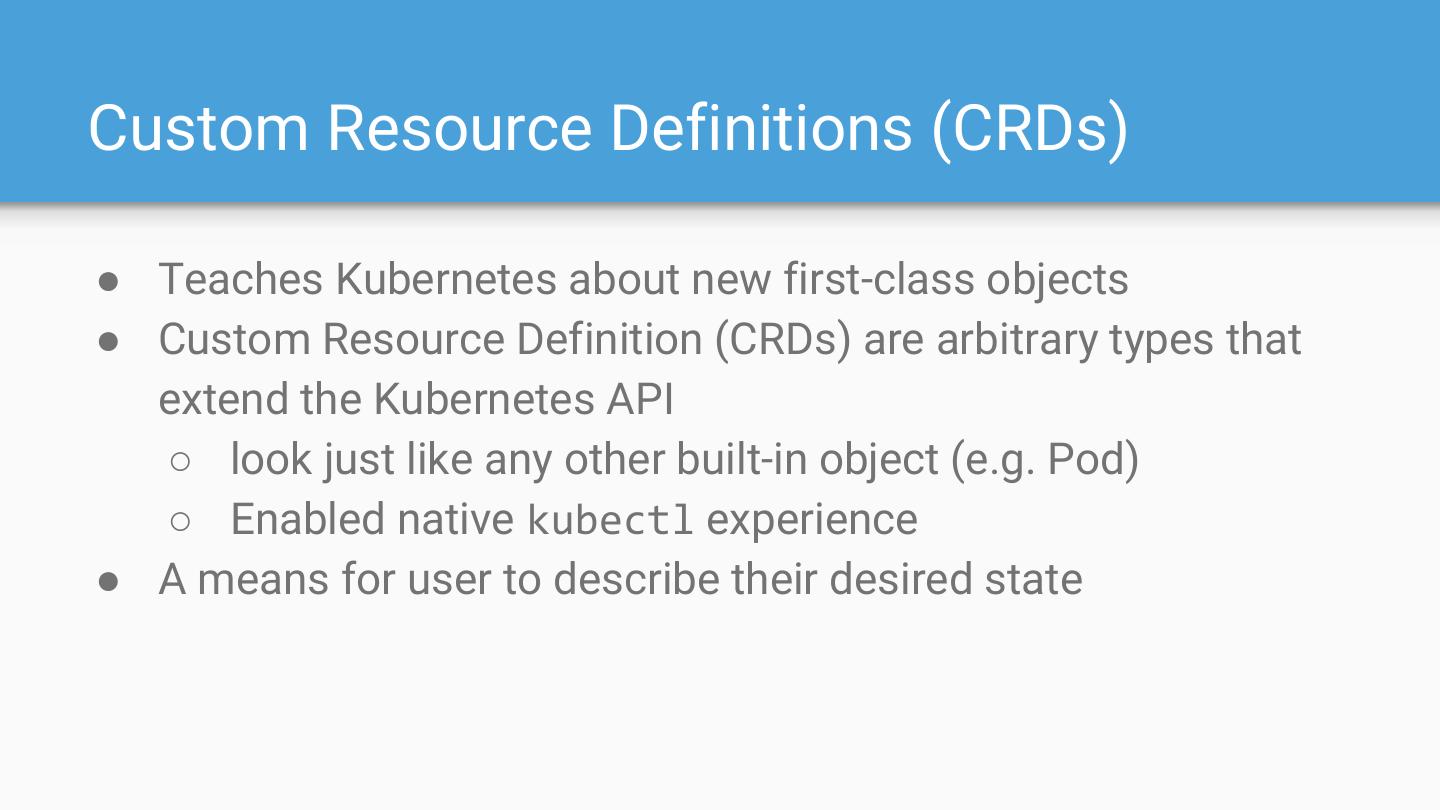 7 .Custom Resource Definitions (CRDs) ● Teaches Kubernetes about new first-class objects ● Custom Resource Definition (CRDs) are arbitrary types that extend the Kubernetes API ○ look just like any other built-in object (e.g. Pod) ○ Enabled native kubectl experience ● A means for user to describe their desired state