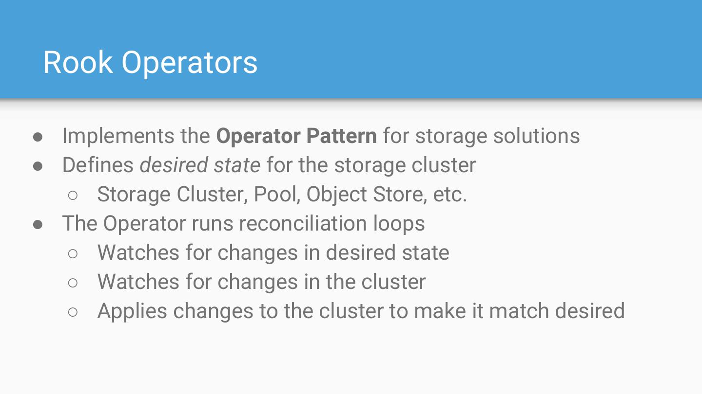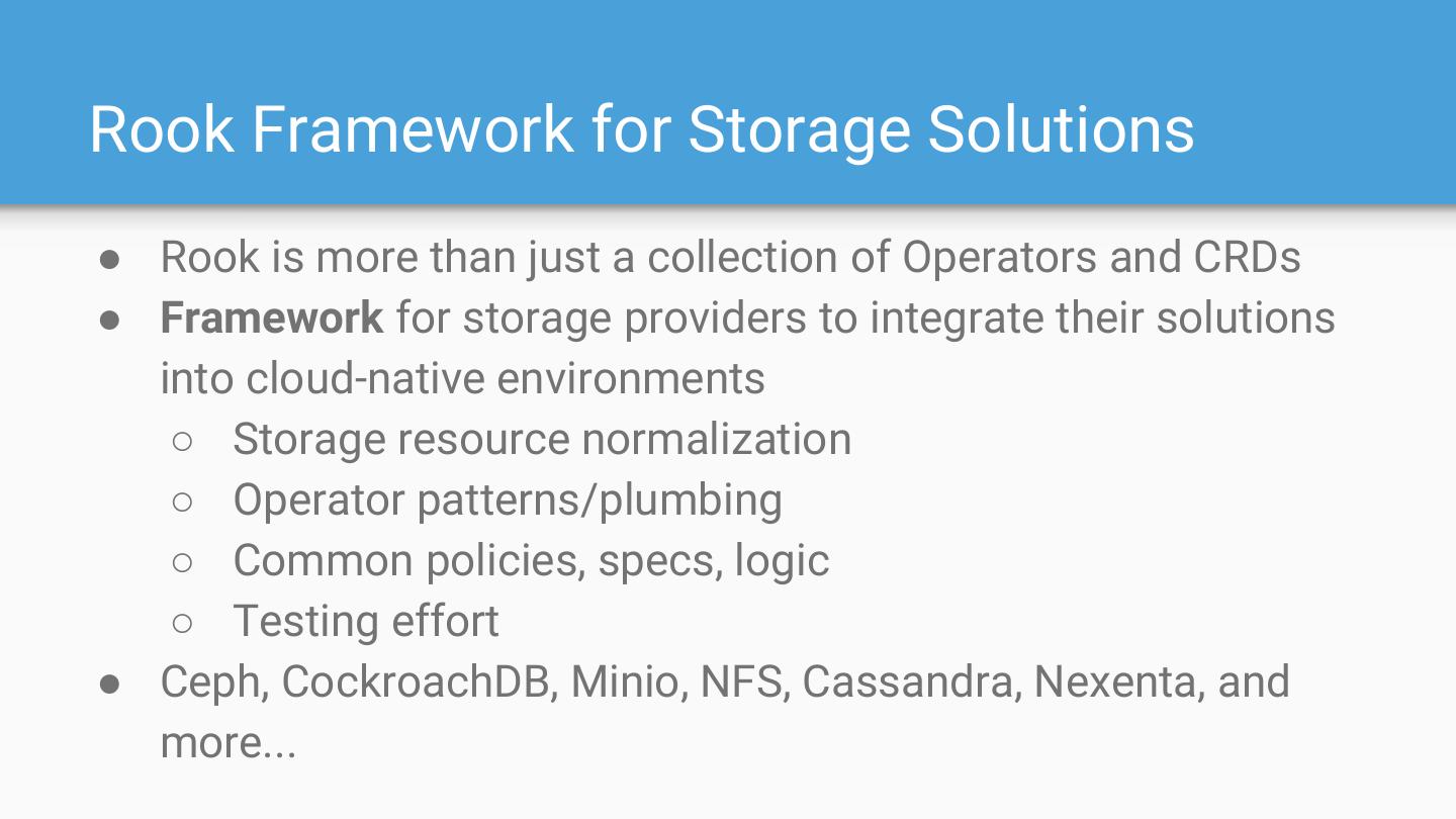12 .Rook Framework for Storage Solutions ● Rook is more than just a collection of Operators and CRDs ● Framework for storage providers to integrate their solutions into cloud-native environments ○ Storage resource normalization ○ Operator patterns/plumbing ○ Common policies, specs, logic ○ Testing effort ● Ceph, CockroachDB, Minio, NFS, Cassandra, Nexenta, and more...