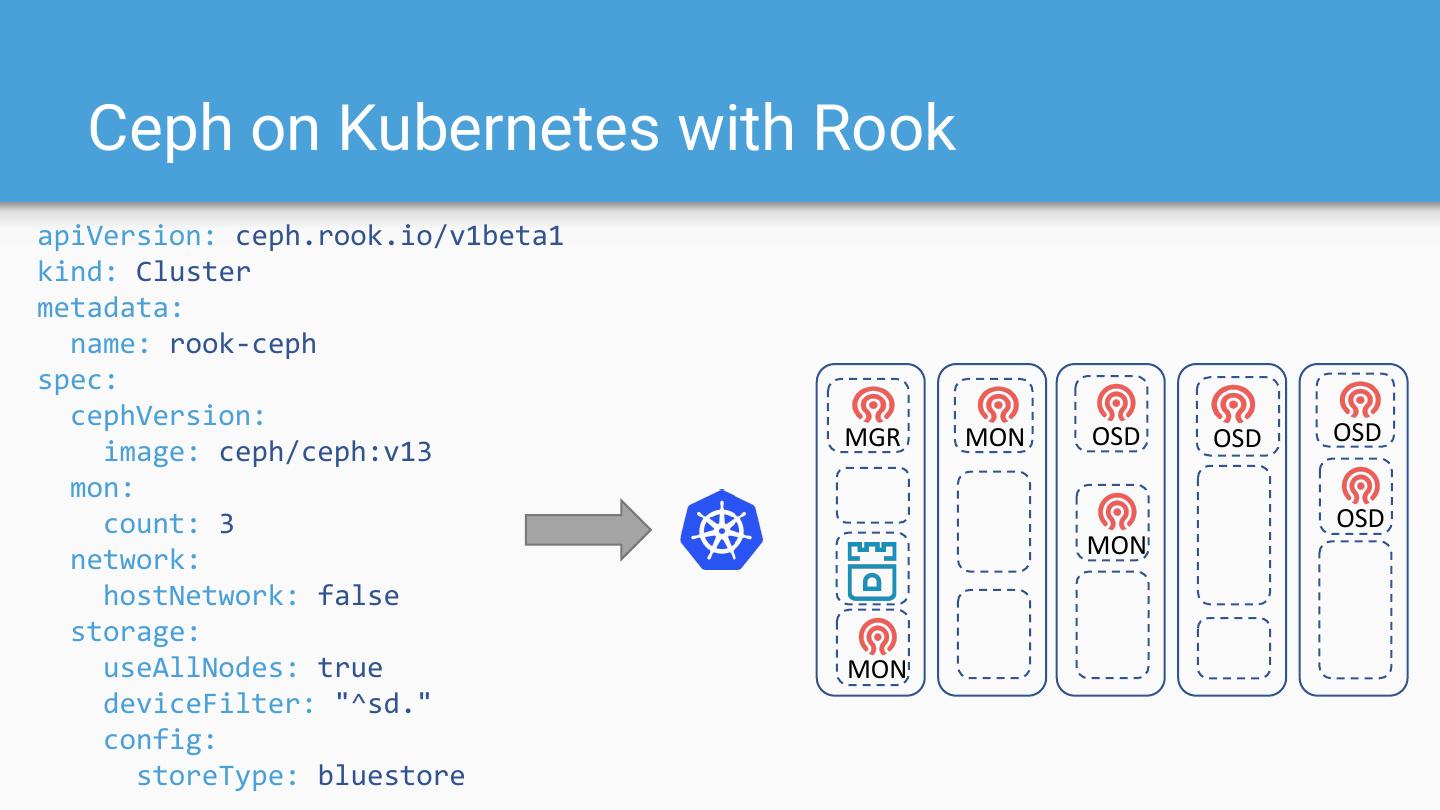 11 . Ceph on Kubernetes with Rook apiVersion: ceph.rook.io/v1beta1 kind: Cluster metadata: name: rook-ceph spec: cephVersion: MGR MON OSD OSD OSD image: ceph/ceph:v13 mon: count: 3 OSD MON network: hostNetwork: false storage: useAllNodes: true MON deviceFilter: "^sd." config: storeType: bluestore