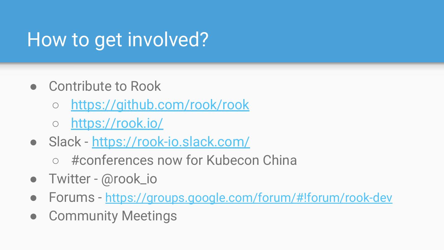 15 .More Sessions ● Meet the Rook Maintainers ○ Chat with project leaders and ask questions ○ Starts in 30 minutes! Wed Nov 14th, 15:00 @ CNCF Booth ● Rook Deep Dive ○ Code & architecture specifics, storage provider integration details ○ Thurs Nov 15th, 14:20