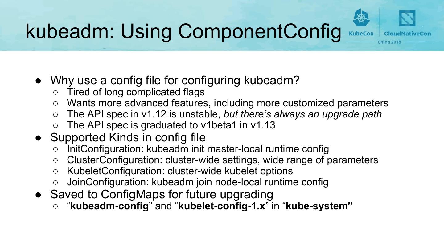 12 .kubeadm: Using ComponentConfig ● Why use a config file for configuring kubeadm? ○ Tired of long complicated flags ○ Wants more advanced features, including more customized parameters ○ The API spec in v1.12 is unstable, but there’s always an upgrade path ○ The API spec is graduated to v1beta1 in v1.13 ● Supported Kinds in config file ○ InitConfiguration: kubeadm init master-local runtime config ○ ClusterConfiguration: cluster-wide settings, wide range of parameters ○ KubeletConfiguration: cluster-wide kubelet options ○ JoinConfiguration: kubeadm join node-local runtime config ● Saved to ConfigMaps for future upgrading ○ “kubeadm-config” and “kubelet-config-1.x” in “kube-system”