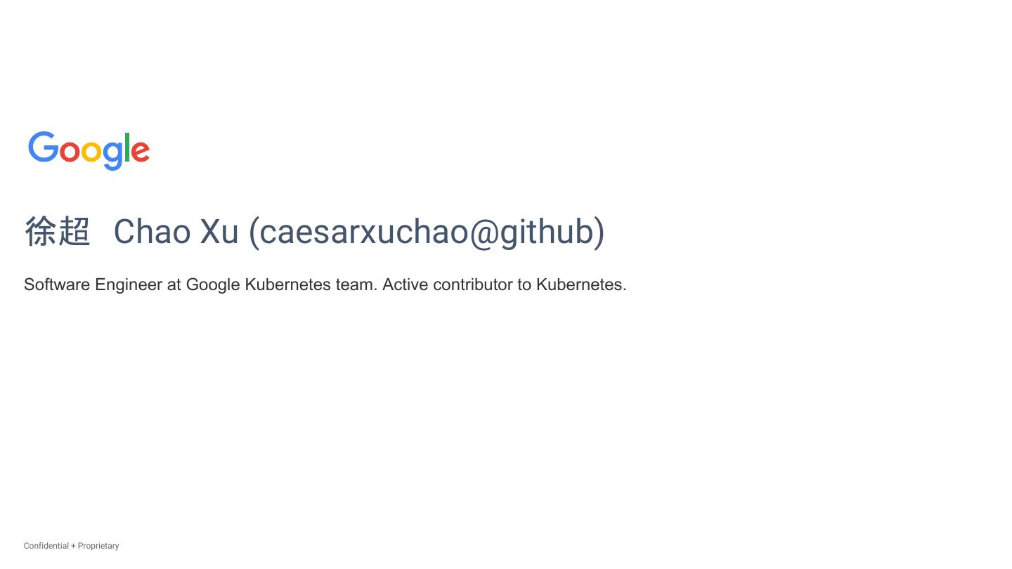 3 .徐超 Chao Xu (caesarxuchao@github) Software Engineer at Google Kubernetes team. Active contributor to Kubernetes. Confidential + Proprietary Confidential + Proprietary