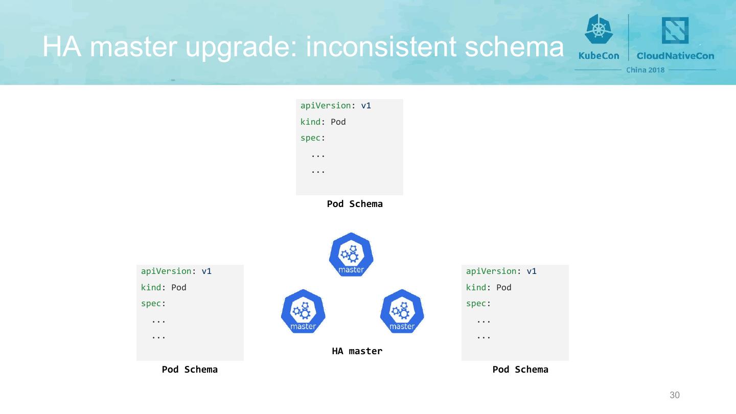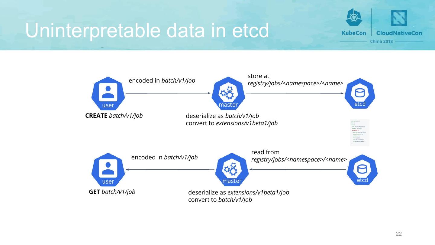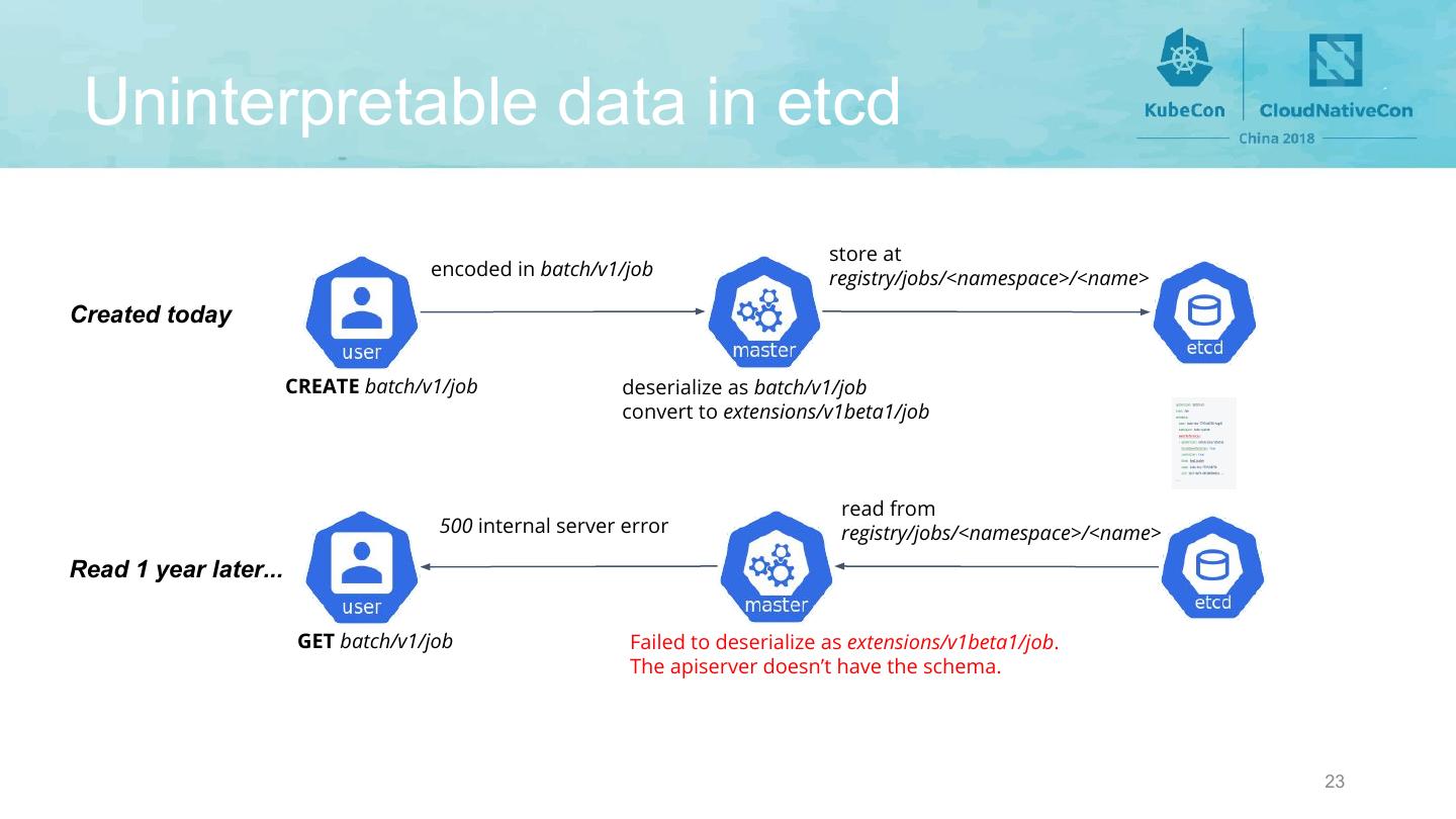 23 . Uninterpretable data in etcd store at encoded in batch/v1/job registry/jobs/<namespace>/<name> Created today CREATE batch/v1/job deserialize as batch/v1/job convert to extensions/v1beta1/job read from 500 internal server error registry/jobs/<namespace>/<name> Read 1 year later... GET batch/v1/job Failed to deserialize as extensions/v1beta1/job. The apiserver doesn’t have the schema. 23