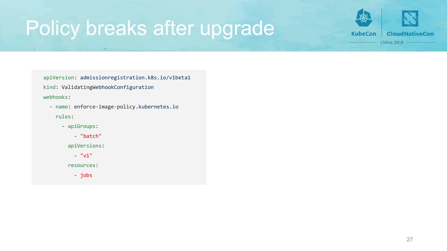 27 .Policy breaks after upgrade apiVersion: admissionregistration.k8s.io/v1beta1 kind: ValidatingWebhookConfiguration webhooks: - name: enforce-image-policy.kubernetes.io rules: - apiGroups: - "batch" apiVersions: - "v1" resources: - jobs 27