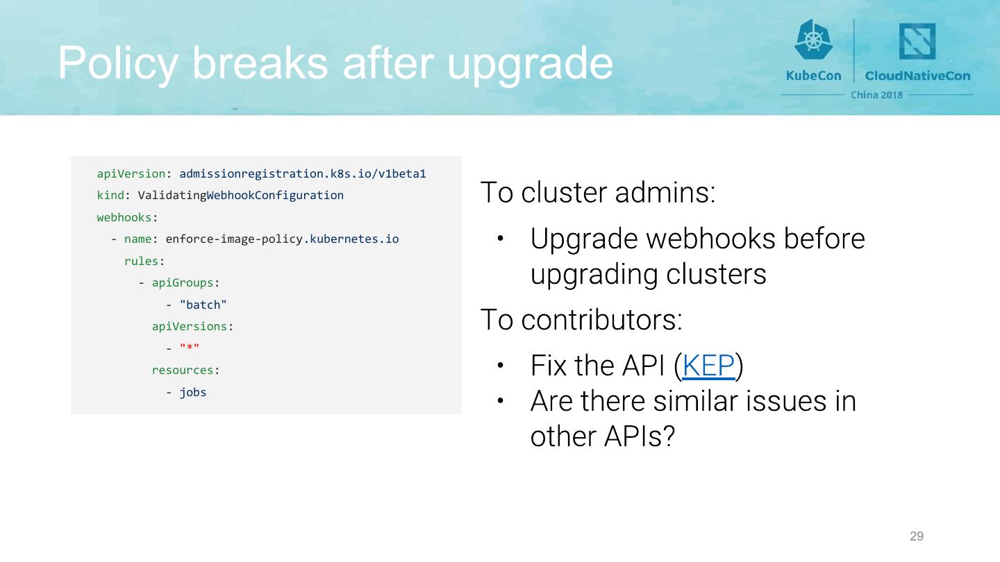 29 .Policy breaks after upgrade apiVersion: admissionregistration.k8s.io/v1beta1 kind: ValidatingWebhookConfiguration webhooks: - name: enforce-image-policy.kubernetes.io rules: - apiGroups: - "batch" apiVersions: - "*" resources: - jobs 29