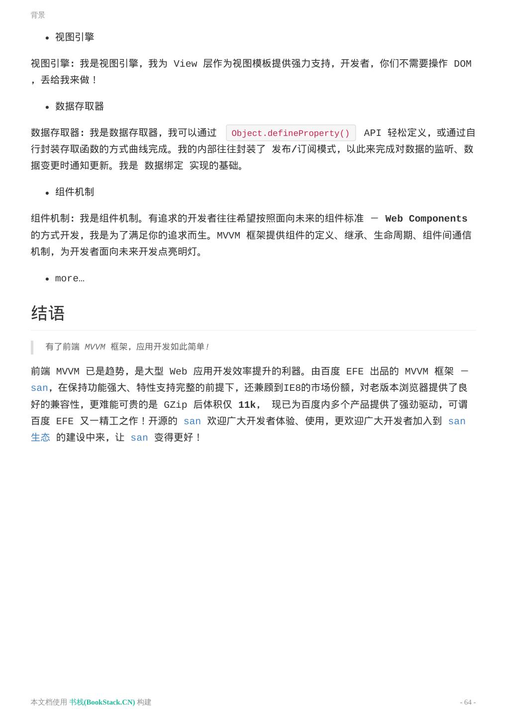 San,是一个 MVVM 的组件框架。它体积小巧(13K),兼容性好(IE6),性能卓越,是一个可靠、可依赖的实现响应式用户界面的解决方案。