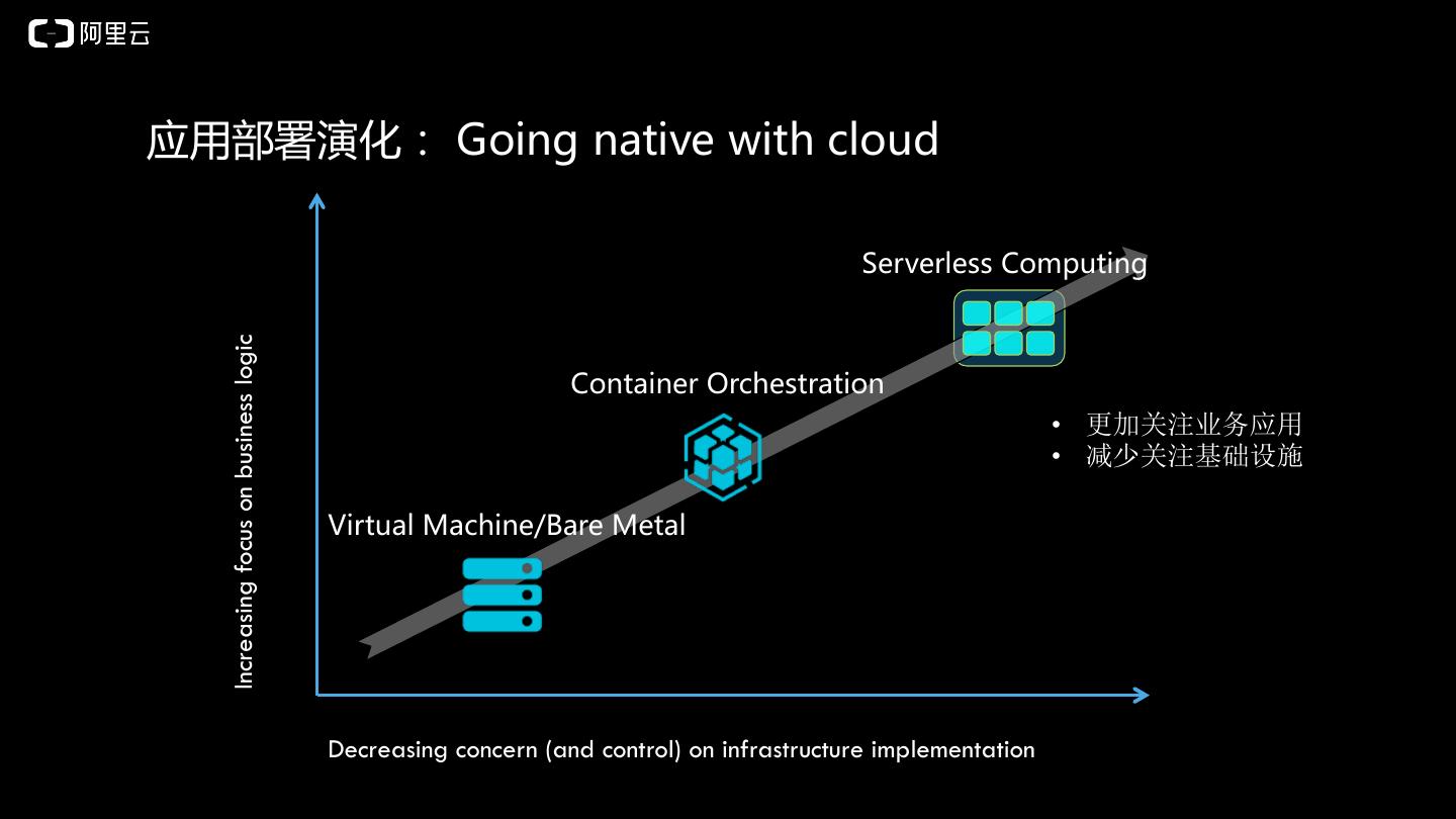 2 .应用部署演化: Going native with cloud Serverless Computing Increasing focus on business logic Container Orchestration • 更加关注业务应用 • 减少关注基础设施 Virtual Machine/Bare Metal Decreasing concern (and control) on infrastructure implementation