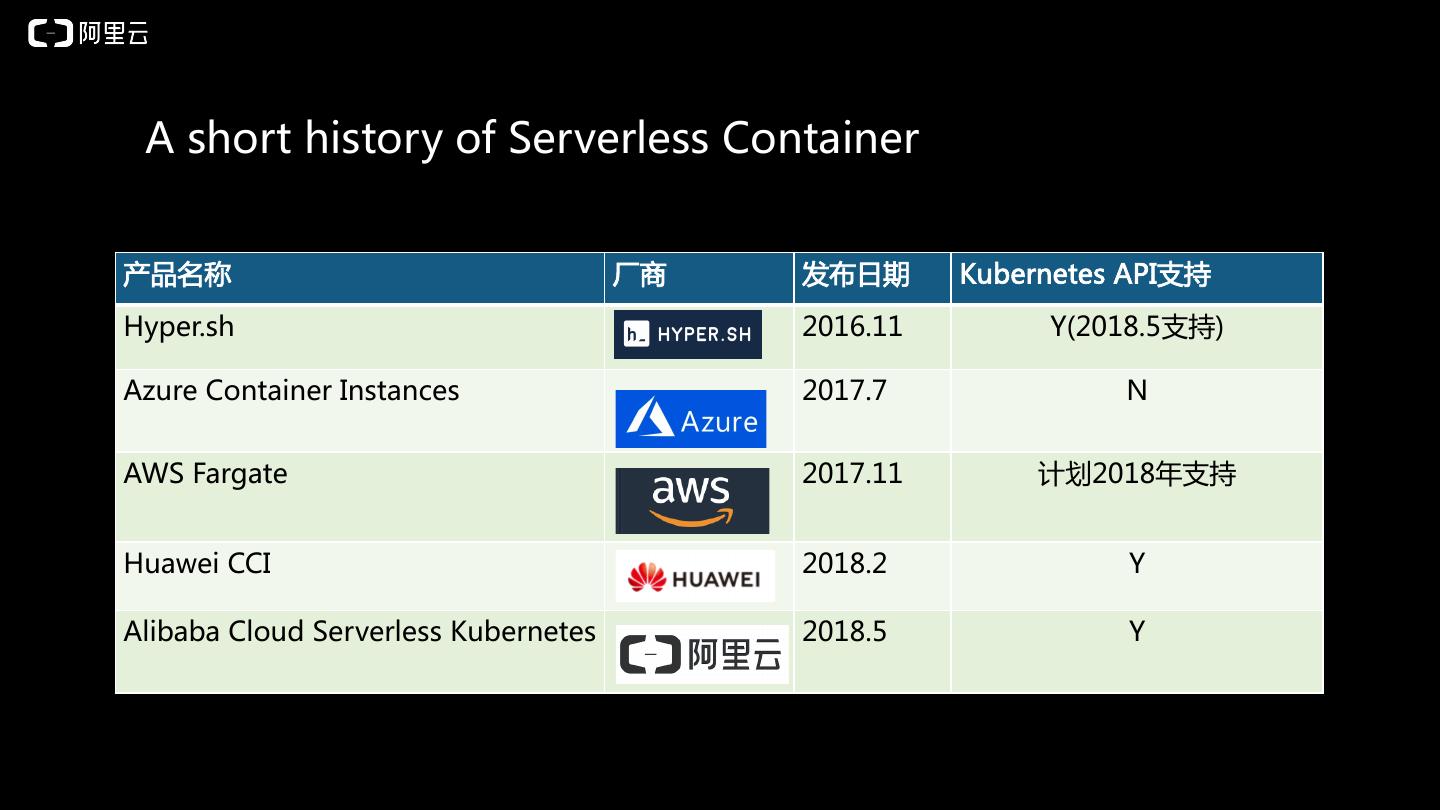 4 . A short history of Serverless Container 产品名称 厂商 发布日期 Kubernetes API支持 Hyper.sh 2016.11 Y(2018.5支持) Azure Container Instances 2017.7 N AWS Fargate 2017.11 计划2018年支持 Huawei CCI 2018.2 Y Alibaba Cloud Serverless Kubernetes 2018.5 Y