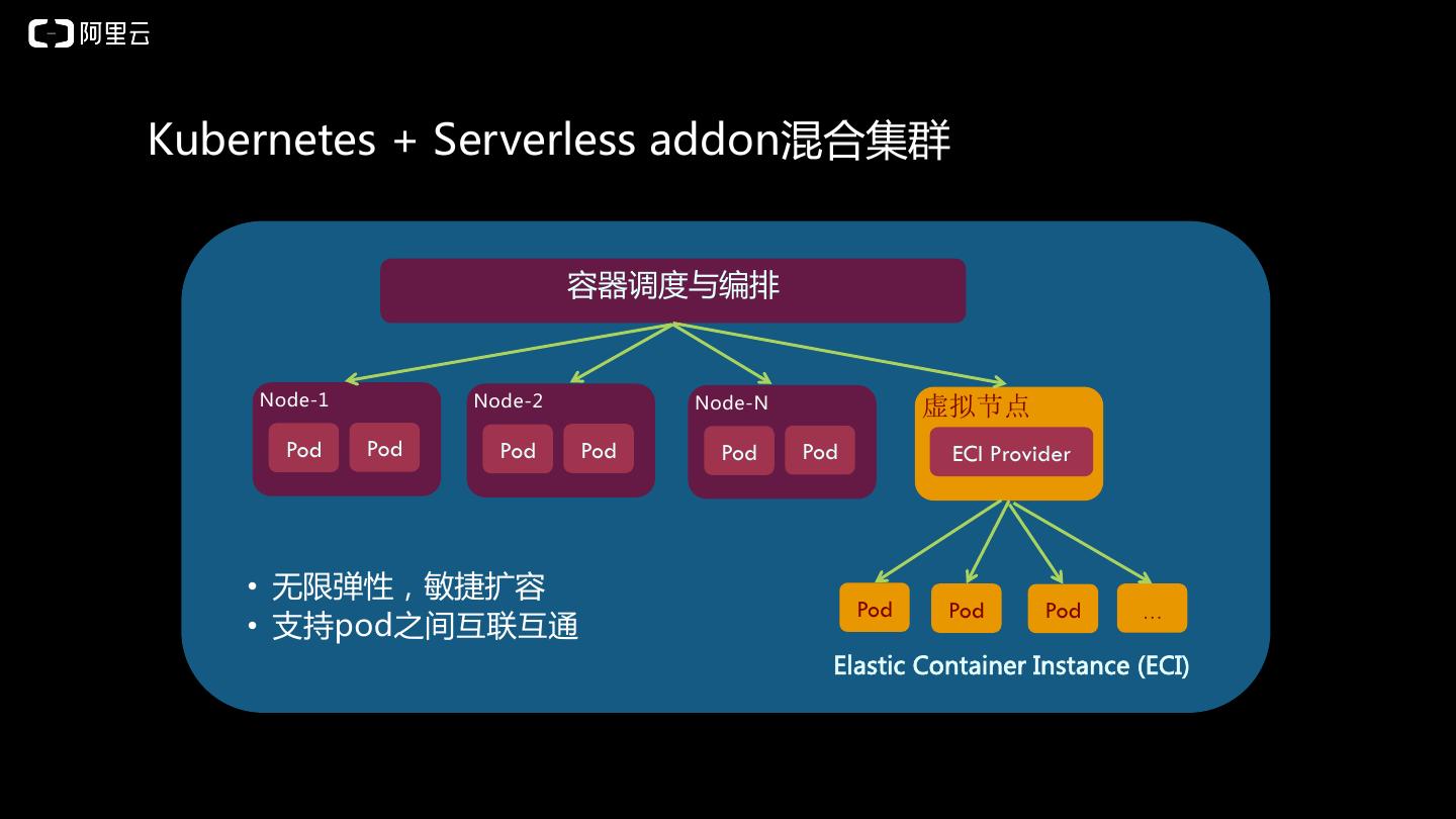 6 .Kubernetes + Serverless addon混合集群 容器调度与编排 Node-1 Node-2 Node-N 虚拟节点 Pod Pod Pod Pod Pod Pod ECI Provider • 无限弹性,敏捷扩容 Pod Pod Pod … • 支持pod之间互联互通 Elastic Container Instance (ECI)