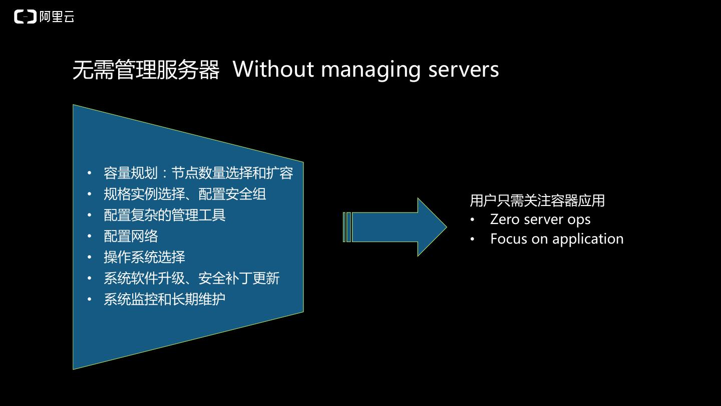 7 .无需管理服务器 Without managing servers • 容量规划:节点数量选择和扩容 • 规格实例选择、配置安全组 用户只需关注容器应用 • 配置复杂的管理工具 • Zero server ops • 配置网络 • Focus on application • 操作系统选择 • 系统软件升级、安全补丁更新 • 系统监控和长期维护