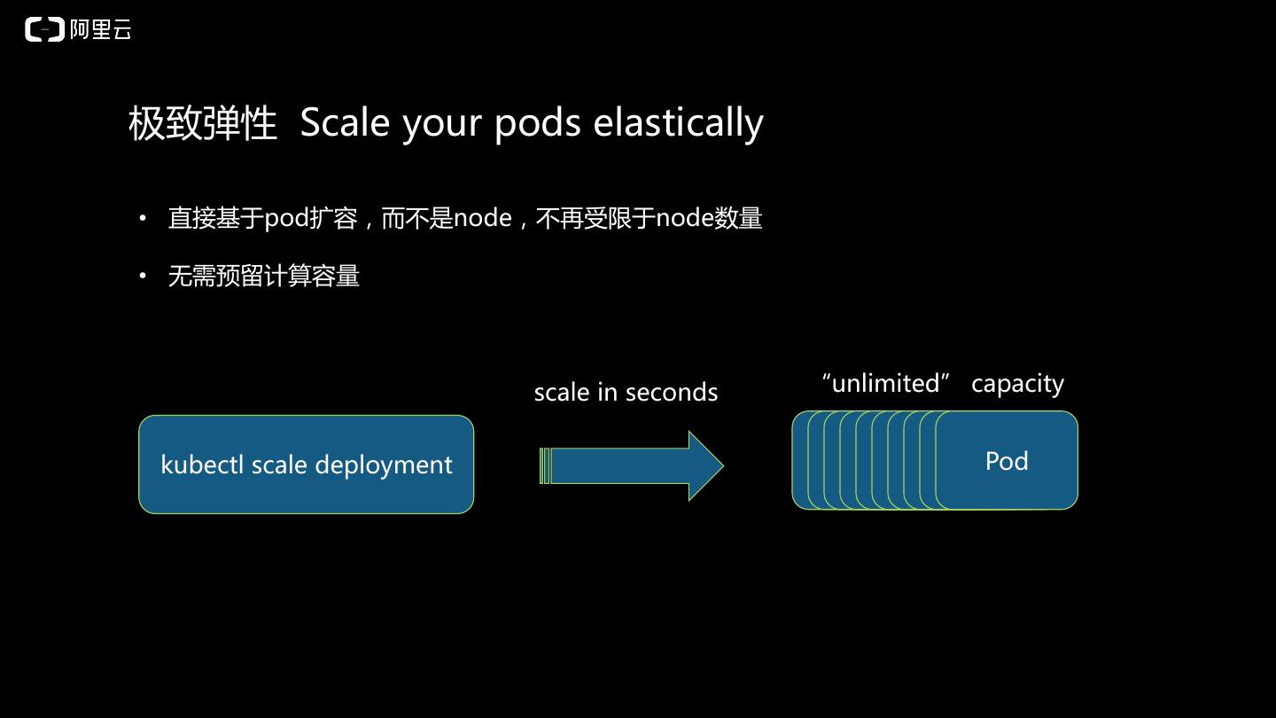8 .极致弹性 Scale your pods elastically • 直接基于pod扩容,而不是node,不再受限于node数量 • 无需预留计算容量 scale in seconds “unlimited” capacity kubectl scale deployment Pod Pod Pod Pod Pod Pod Pod Pod Pod Pod