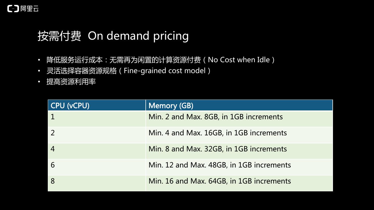 9 .按需付费 On demand pricing • 降低服务运行成本:无需再为闲置的计算资源付费(No Cost when Idle) • 灵活选择容器资源规格(Fine-grained cost model) • 提高资源利用率 CPU (vCPU) Memory (GB) 1 Min. 2 and Max. 8GB, in 1GB increments 2 Min. 4 and Max. 16GB, in 1GB increments 4 Min. 8 and Max. 32GB, in 1GB increments 6 Min. 12 and Max. 48GB, in 1GB increments 8 Min. 16 and Max. 64GB, in 1GB increments
