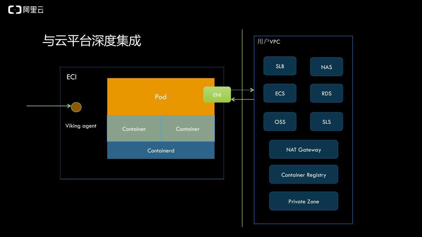 12 .与云平台深度集成 用户VPC SLB NAS ECI Pod ENI ECS RDS Pod OSS SLS Viking agent Container Container Containerd NAT Gateway Container Registry Private Zone