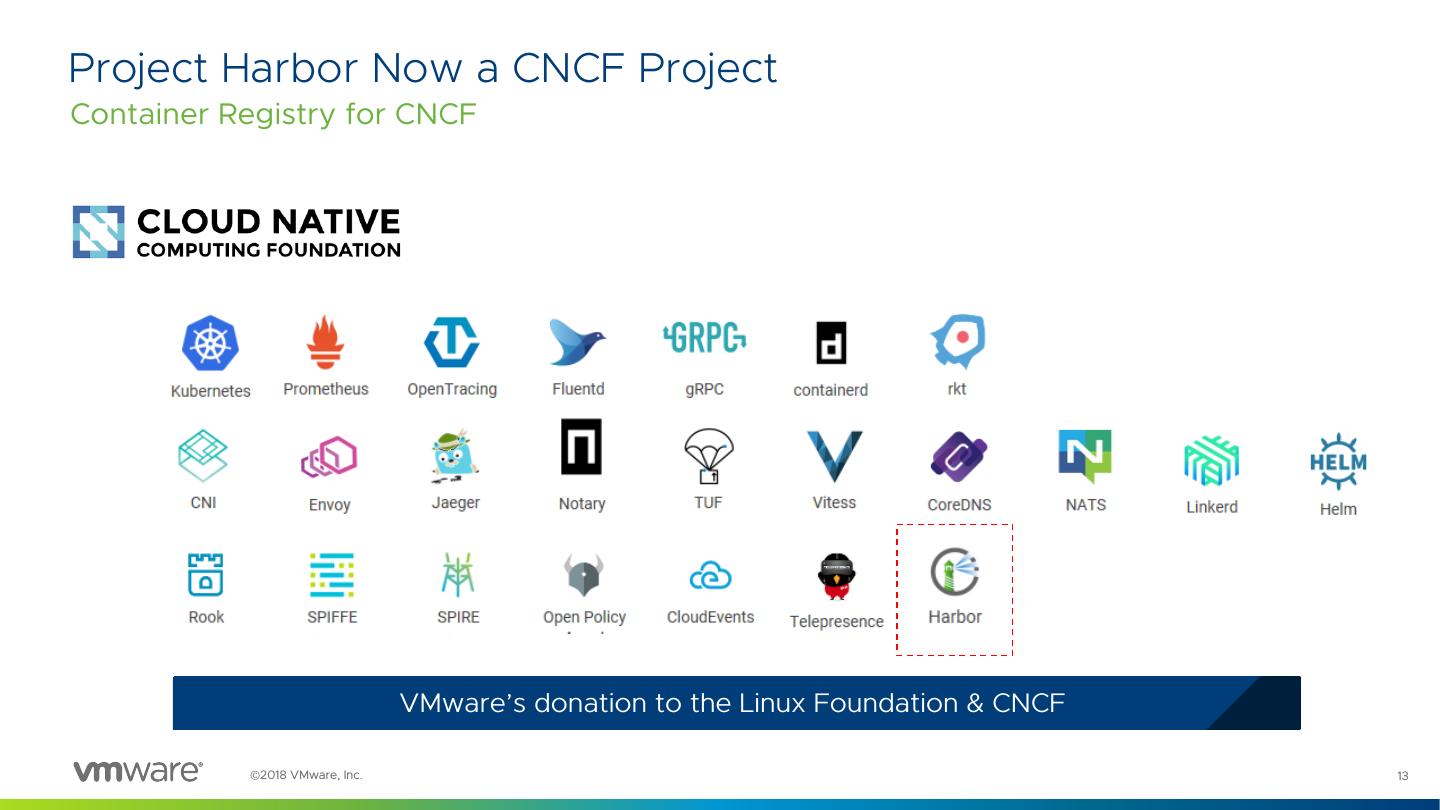 13 .Project Harbor Now a CNCF Project Container Registry for CNCF VMware’s donation to the Linux Foundation & CNCF ©2018 VMware, Inc. 13