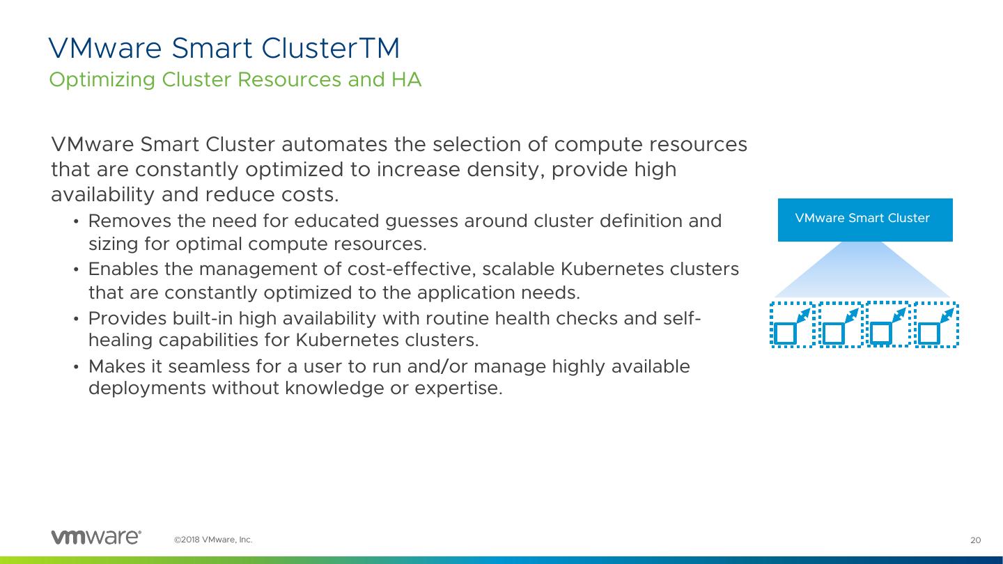 20 .VMware Smart ClusterTM Optimizing Cluster Resources and HA VMware Smart Cluster automates the selection of compute resources that are constantly optimized to increase density, provide high availability and reduce costs. • Removes the need for educated guesses around cluster definition and VMware Smart Cluster sizing for optimal compute resources. • Enables the management of cost-effective, scalable Kubernetes clusters that are constantly optimized to the application needs. • Provides built-in high availability with routine health checks and self- healing capabilities for Kubernetes clusters. • Makes it seamless for a user to run and/or manage highly available deployments without knowledge or expertise. ©2018 VMware, Inc. 20