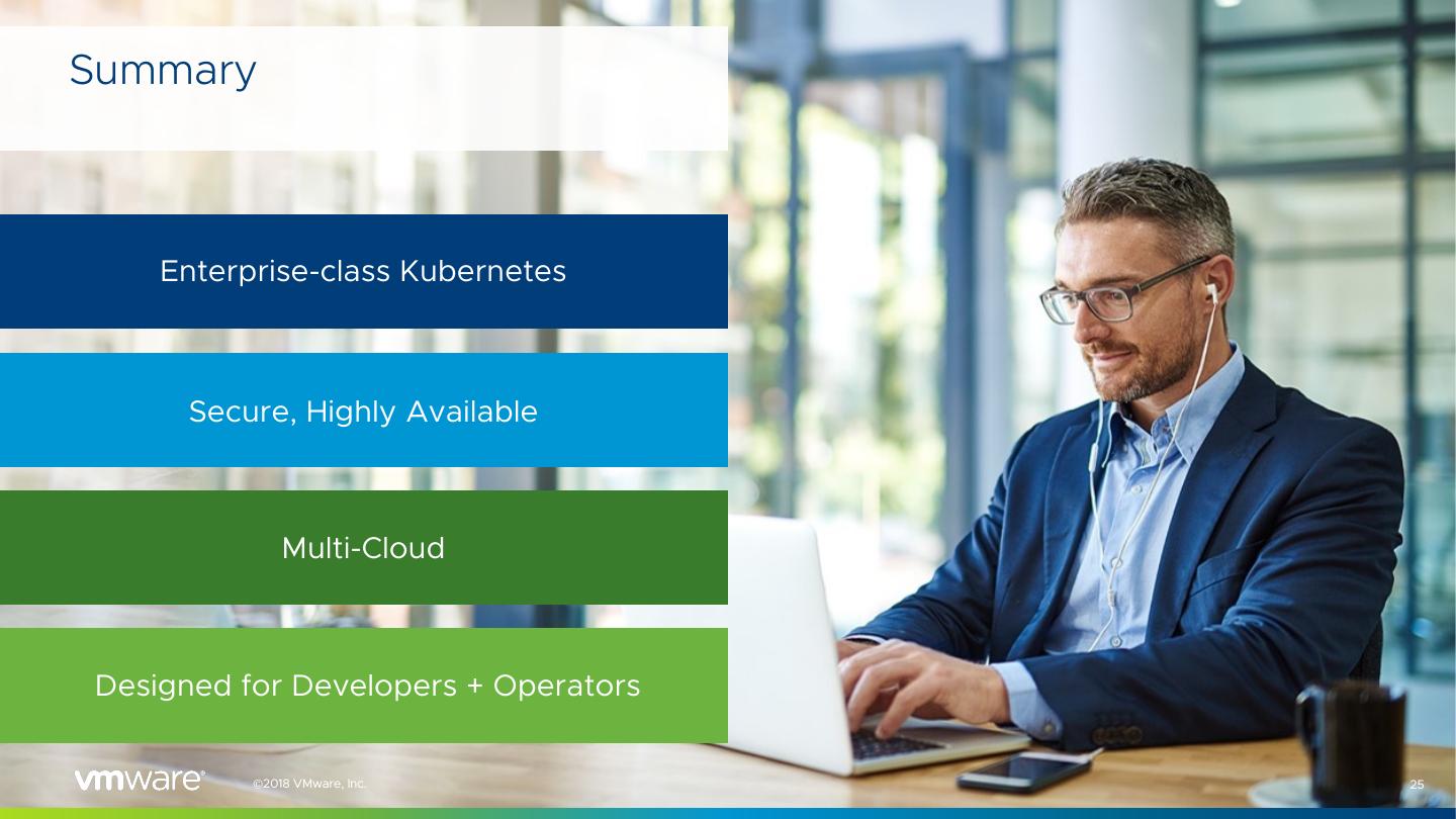 25 .Summary Enterprise-class Kubernetes Secure, Highly Available Multi-Cloud Designed for Developers + Operators ©2018 VMware, Inc. 25