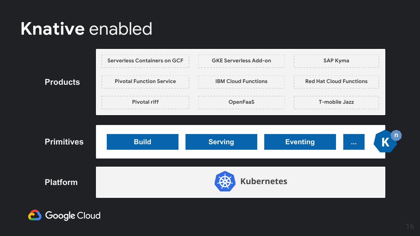 16 .Knative enabled Serverless Containers on GCF GKE Serverless Add-on SAP Kyma Products Pivotal Function Service IBM Cloud Functions Red Hat Cloud Functions Pivotal riff OpenFaaS T-mobile Jazz Primitives Build Serving Eventing ... Platform Kubernetes 16
