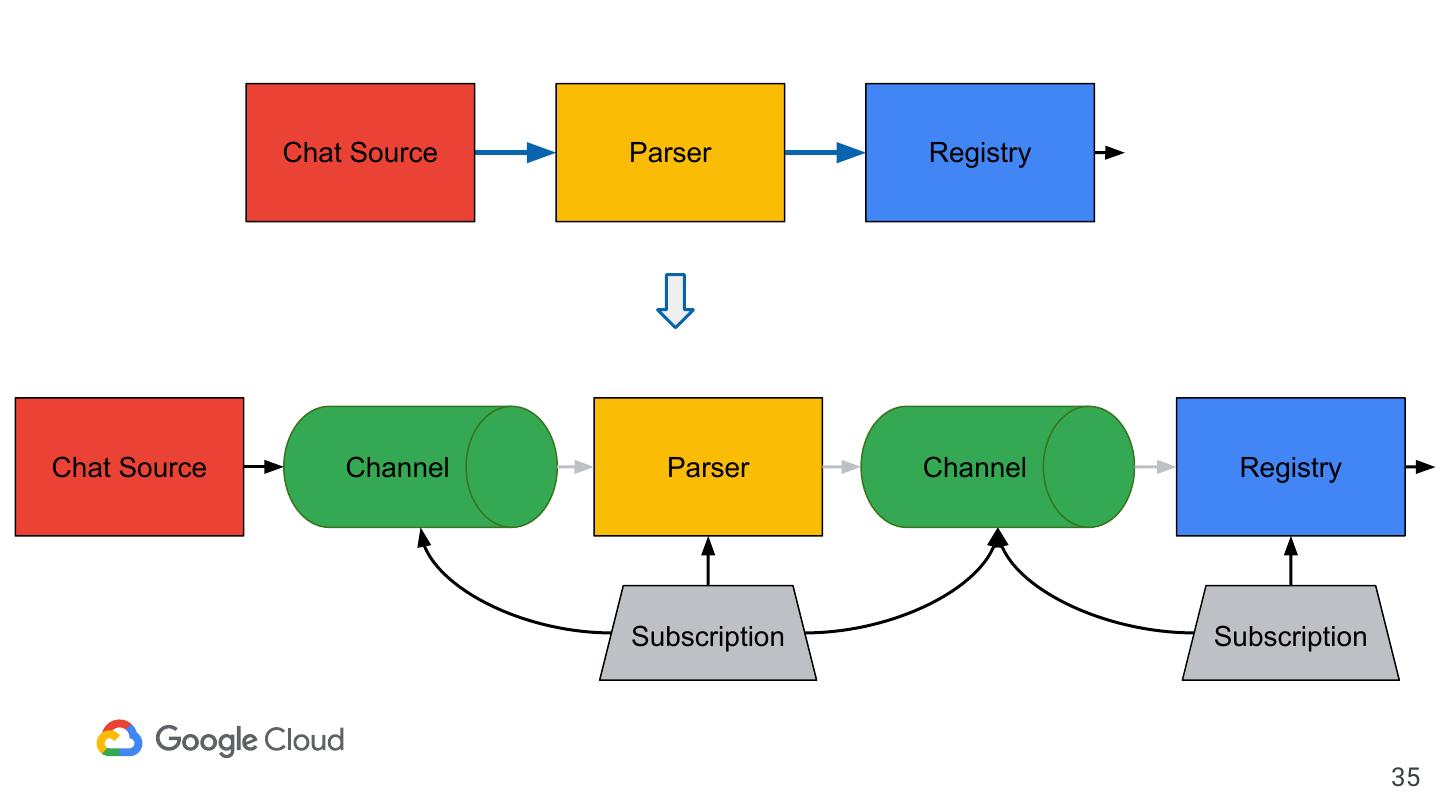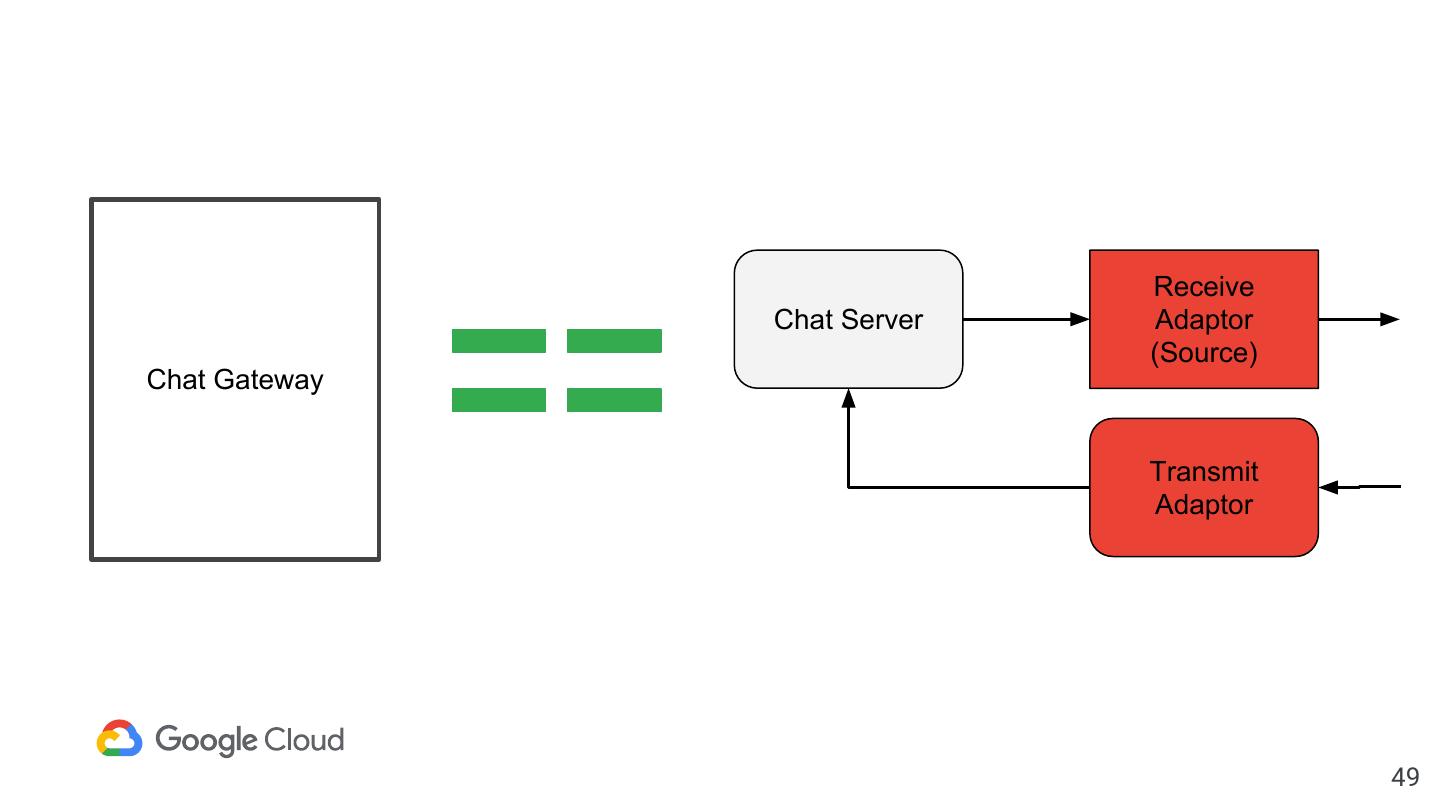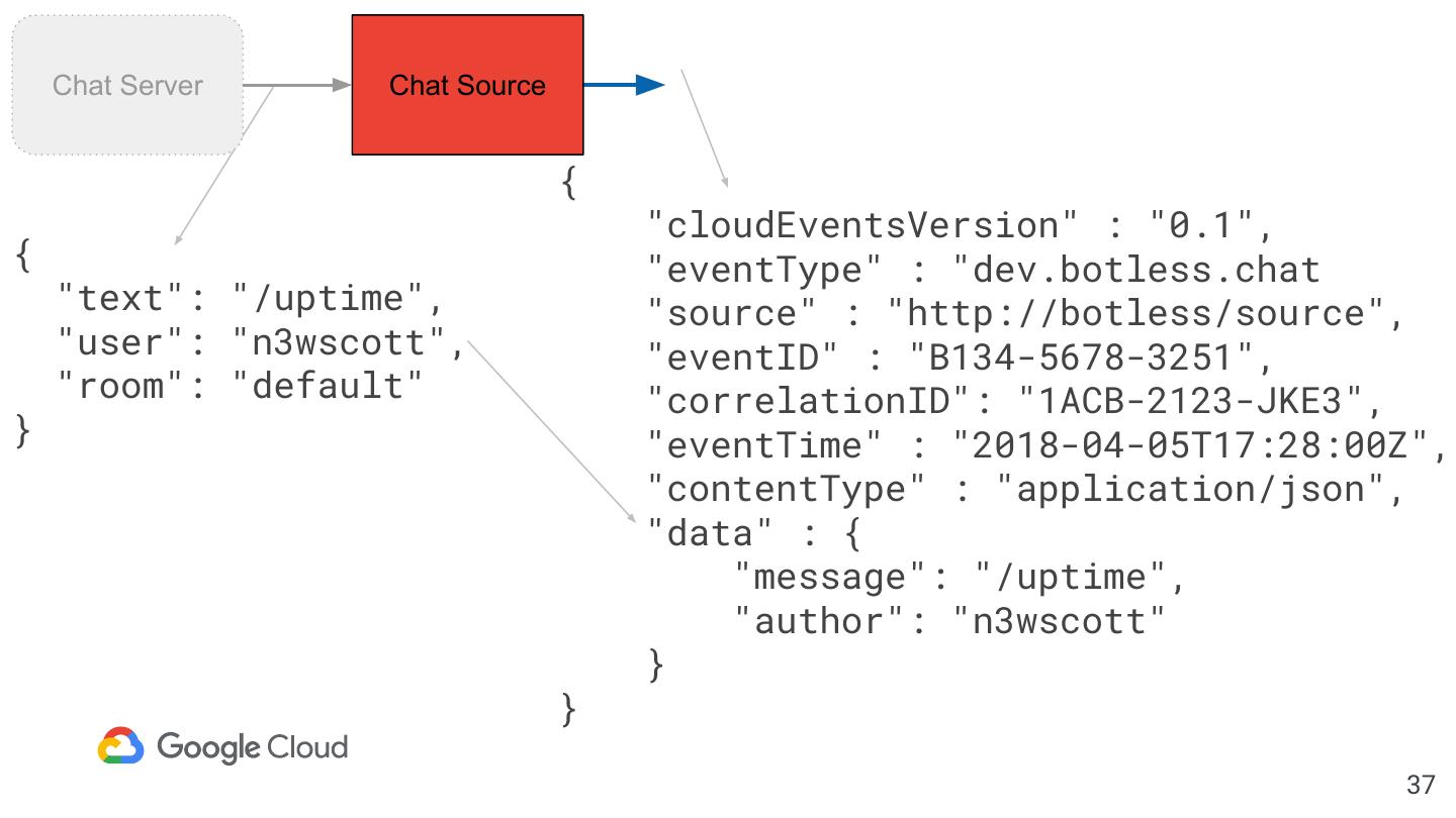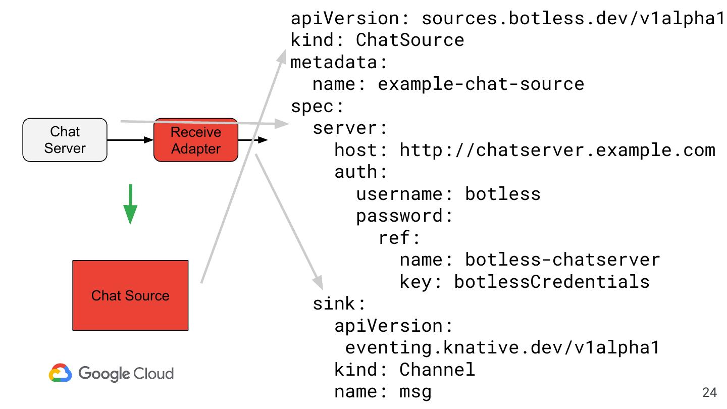 24 . apiVersion: sources.botless.dev/v1alpha1 kind: ChatSource metadata: name: example-chat-source spec: Chat Receive server: Server Adapter host: http://chatserver.example.com auth: username: botless password: ref: name: botless-chatserver key: botlessCredentials Chat Source sink: apiVersion: eventing.knative.dev/v1alpha1 kind: Channel name: msg 24