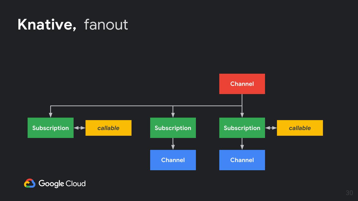 29 .Knative, subscriptions apiVersion: eventing.knative.dev/v1alpha1 kind: Subscription metadata: name: sub-example namespace: default spec: channel: apiVersion: eventing.knative.dev/v1alpha1 kind: Channel Channel name: upstream-channel subscriber: ref: apiVersion: serving.knative.dev/v1alpha1 kind: Service Subscription callable name: caller-example reply: channel: apiVersion: eventing.knative.dev/v1alpha1 Channel kind: Channel name: downstream-channel 29
