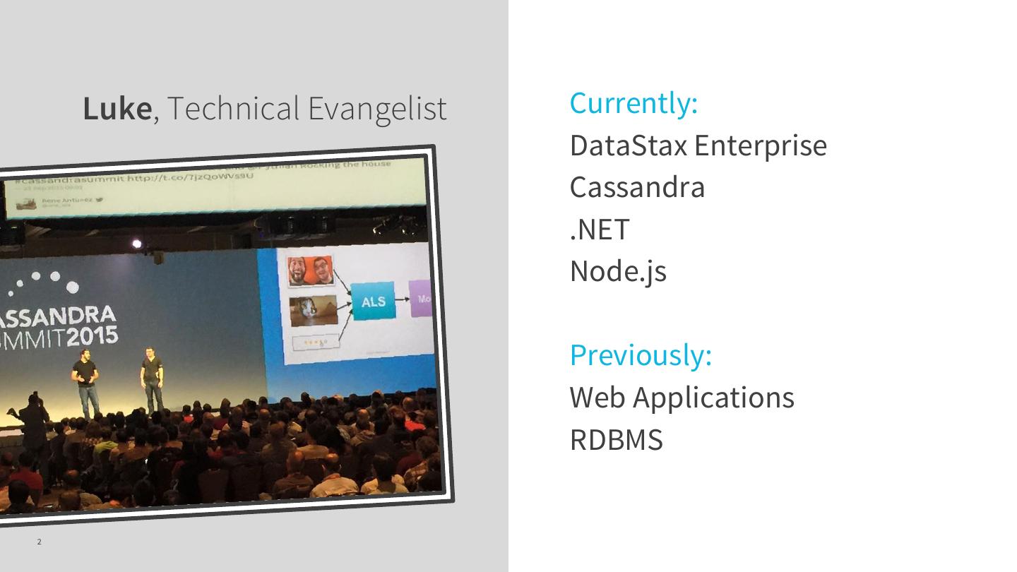 2 . Luke, Technical Evangelist Currently: DataStax Enterprise Cassandra .NET Node.js Previously: Web Applications RDBMS 2