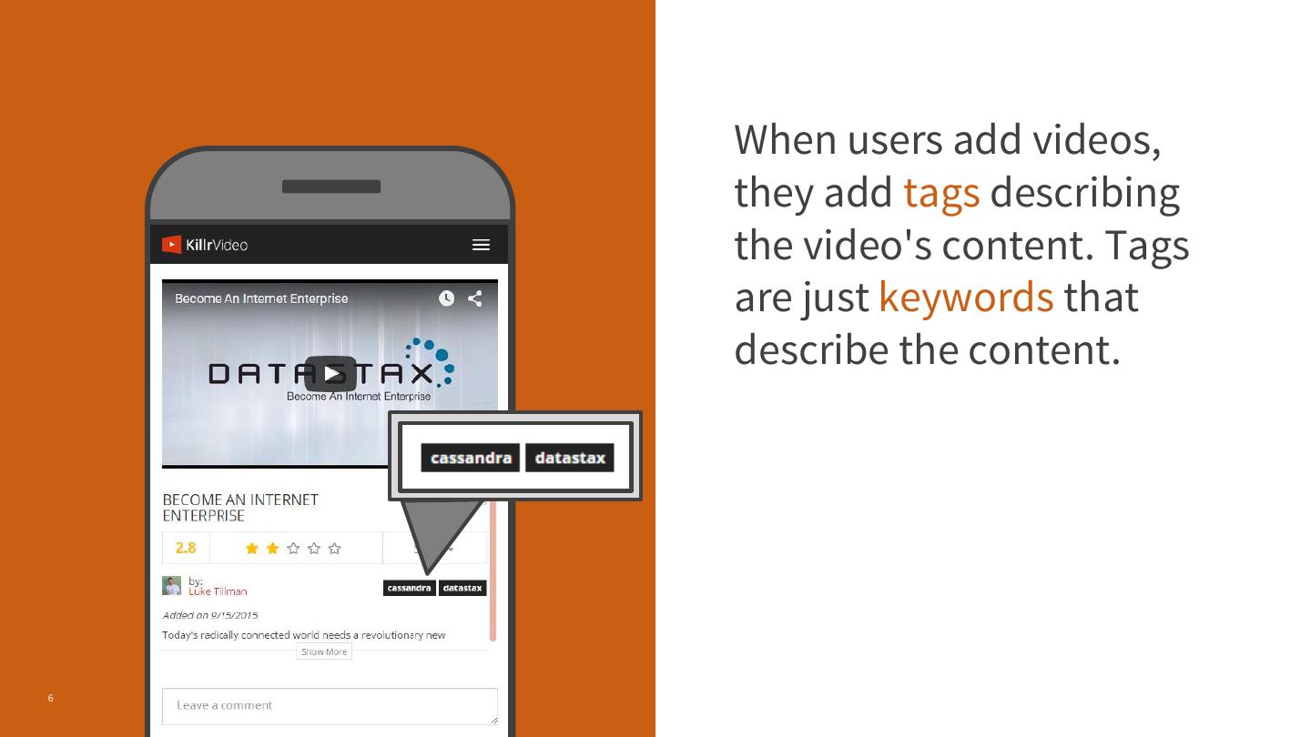 7 . CREATE TABLE videos_by_tag ( tag text, What about searching for videoid uuid, keywords in the title or added_date timestamp, userid uuid, description? Users expect name text, more from search. preview_image_location text, tagged_date timestamp, PRIMARY KEY (tag, videoid) ); SELECT * FROM videos_by_tag WHERE tag = 'cassandra'; 7