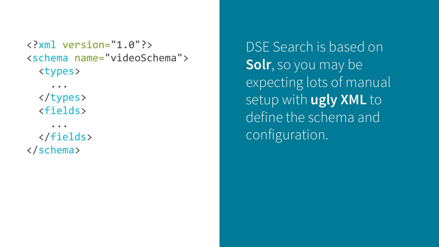 10 .<?xml version="1.0"?> DSE Search is based on <schema name="videoSchema"> <types> Solr, so you may be ... expecting lots of manual </types> setup with ugly XML to <fields> ... define the schema and </fields> configuration. </schema>