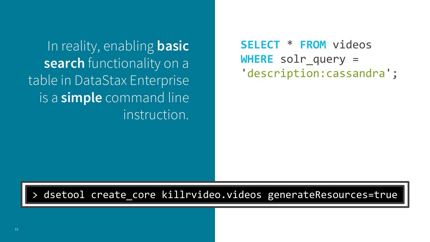 11 . In reality, enabling basic SELECT * FROM videos search functionality on a WHERE solr_query = 'description:cassandra'; table in DataStax Enterprise is a simple command line instruction. > dsetool create_core killrvideo.videos generateResources=true 11