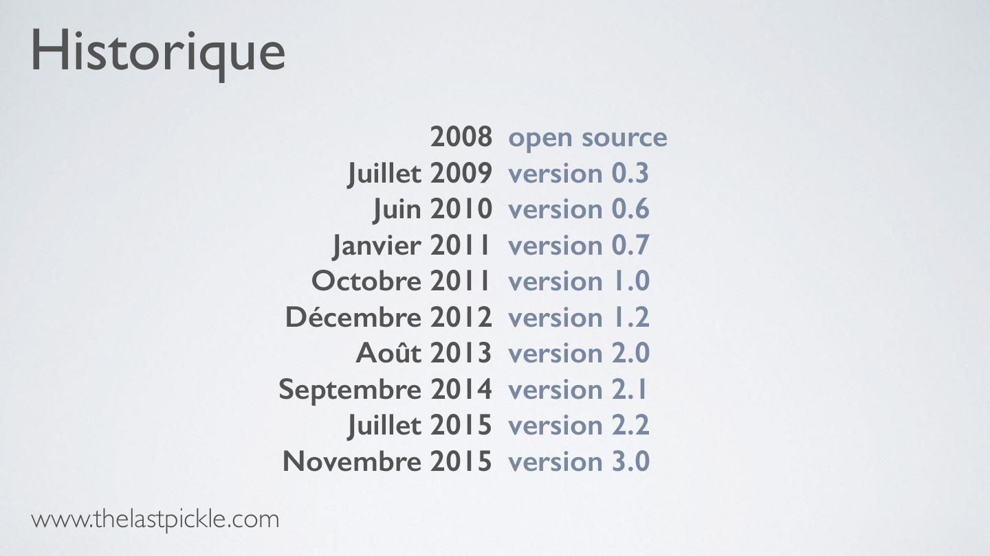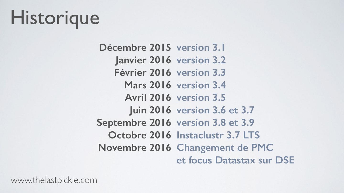 6 .Historique Décembre 2015 version 3.1 Janvier 2016 version 3.2 Février 2016 version 3.3 Mars 2016 version 3.4 Avril 2016 version 3.5 Juin 2016 version 3.6 et 3.7 Septembre 2016 version 3.8 et 3.9 Octobre 2016 Instaclustr 3.7 LTS Novembre 2016 Changement de PMC et focus Datastax sur DSE www.thelastpickle.com